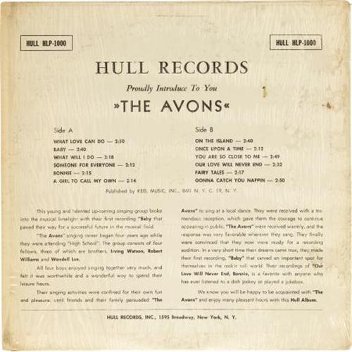 <B>Avons</B></I> <B><I>Hull Records Cordially Invite You To Meet The Avons</B></I></B></I> <B>LP (Hull 1000, 1960).</B></I> The New Jersey doo-wop had an ardent, loyal following in the '50s, which ultimately led to their signing by the pre-eminent doo-wop label, Hull Records (the Heartbeats, Shep & the Limelites). Unfortunately, the group never charted nationally, although they maintained their popularity locally well into the '60s. Decades later, many have discovered them and their rare album from 1961. You probably won't find a nicer copy of the record; the cover does have minor wear at the top right corner. Condition: VG-EX 6 (cover)/ NM 8 (record).<BR><BR><b>Shipping:</b> Recordings (<a target="_blank" href="http://www.heritageauctions.com/common/shipping.php">view shipping information</a>)