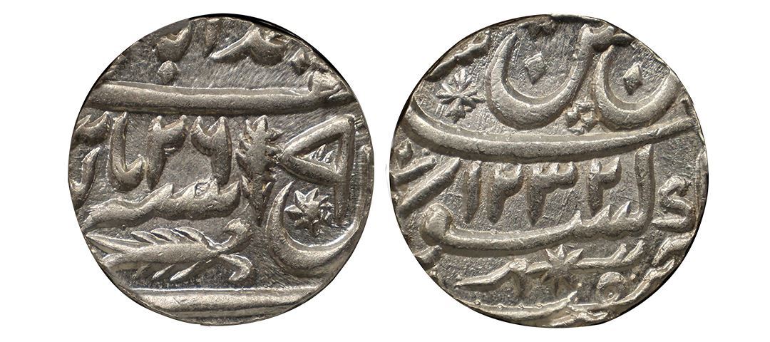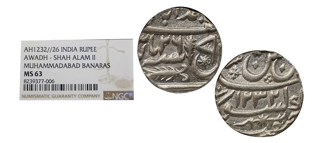 Awadh, Muhamadabad Banaras, Silver Rupee, AH 1232/26 RY, "Saya-e-Fazle elah" Couplet. In the name of Shah Alam II, Obv: Persian legend "sikka zad haft kishwar saya-e-fazle elah, Hami din-e-Muhammad Shah Alam Badshah", star, date, Rev: Persian legend "sana 26 julus" & "zarb Muhammadabad Banaras", mint mark flag and star, fish, (KM# 103.2), nice luster, superb quality graded by NGC as MS 63, Rare.