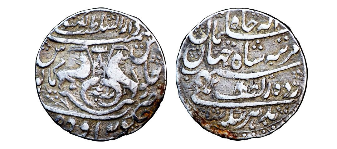 Awadh State, Nasir-ud-Din Haider (AH 1243-1253, 1827-1837 AD), Silver Rupee, 10.96 gms, Dar al-Sultanate Lakhnau Suba Awadh Mint, RY Ahd, Sulayman Jah legend on obv, KM # 186, very fine, rare.