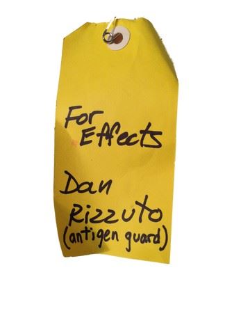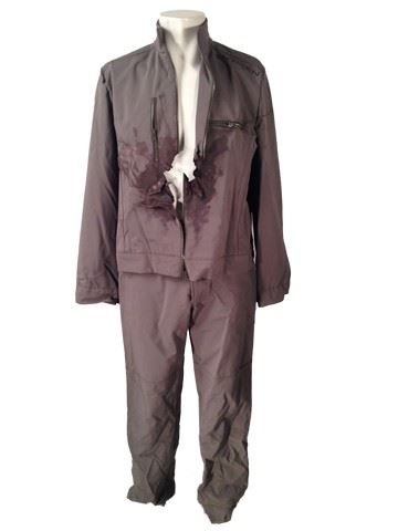Antigen Guard (Dan Rizzuto) screen worn, stunt, torn and bloody F/X Antigen uniform including: torn and bloody jacket with Antigen name on front, and grey pants. Includes wardrobe tag.