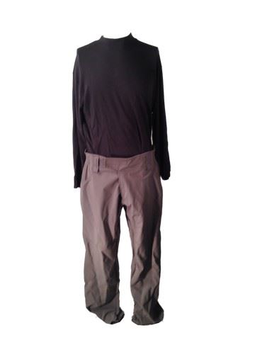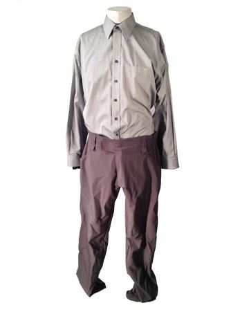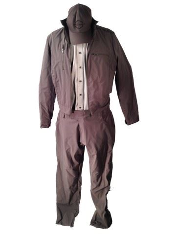 Antigen guard screen worn stunt uniform, including: grey windbreaker with Antigen name on front (size 38), grey uniform pants (size 36-38), 'Coal Harbor' long sleeve shirt (size L), Joseph & Feiss button down shirt (size 16.5-34/35), baseball cap with Antigen name and logo.