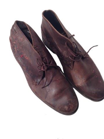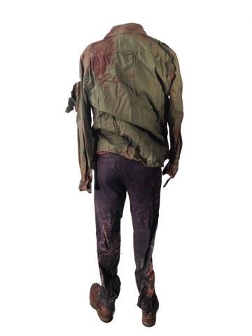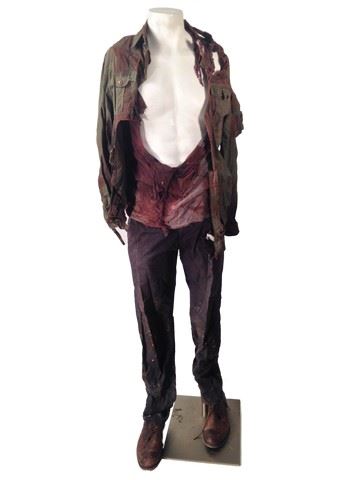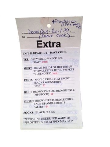 Dead Guy - Exit 39 (Dave Cook) screen worn torn and bloody outfit, including: ripped and bloody 'bluenotes' shirt (size M), ripped and bloody t-shirt (size S), bloody 'Gap' pants, brown textured leather 'Aldo' ankle boots (size 44),
