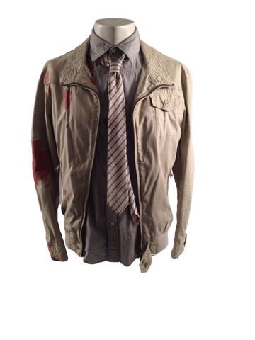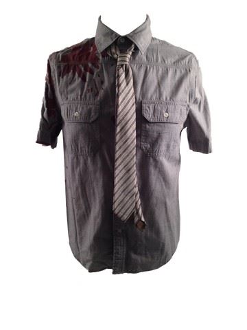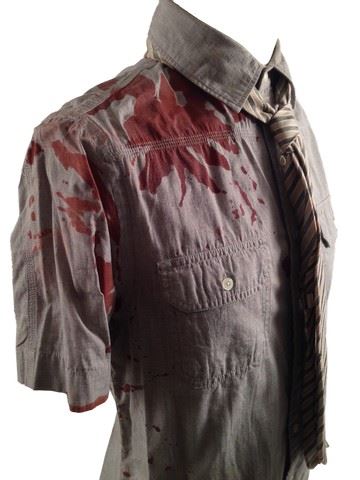 Med Tech screen worn bloody outfit, including: 'Zara Man Basic' bloody jacket 'Old Navy' bloody long sleeve shirt (size S/P), and stripped tie with blood smears around the collar.