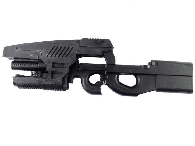 SWAT guard screen used black P-90 made from rubber. Bottom sides had rubber flashlight attachments removed. This is a prop only and cannot be made to fire in any way. (approx. 27 3/4" x 8 3/8")