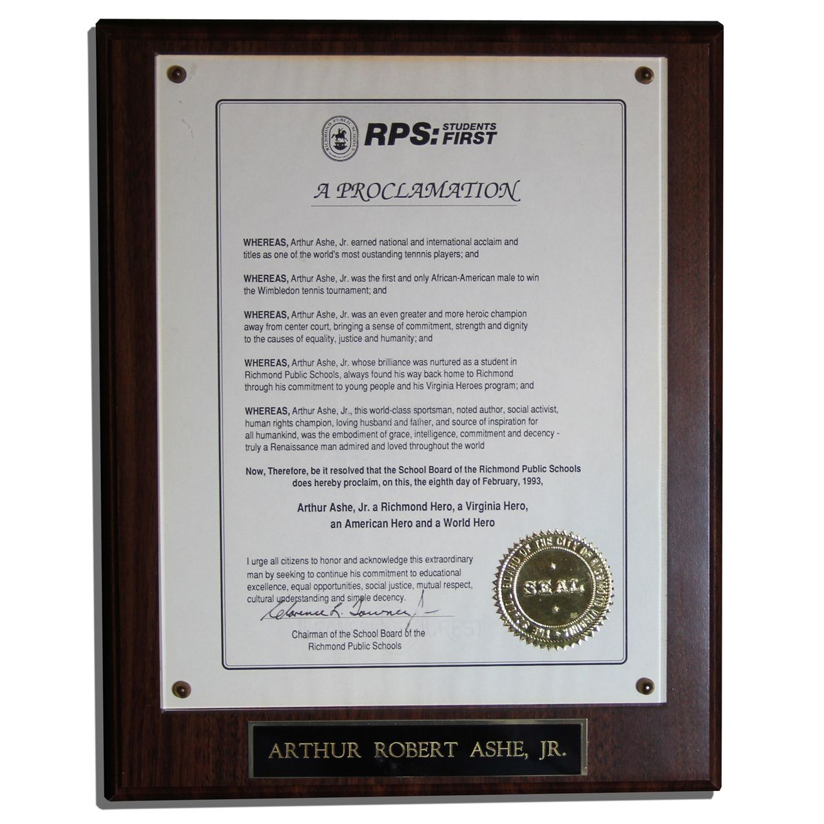 Award presented to Arthur Ashe from Richmond Public Schools, where he attended school as a youth. Here, the school system recognizes his incredible achievements with a certificate mounted behind beveled glass. It reads in part: ''...whose brilliance was nurtured as a student in Richmond Public Schools, always found his way back home to Richmond...was the embodiment of grace...source of inspiration for all humankind...'' Plaque was bestowed on Ashe in 1993, the year of his death. Certificate bears a School Board of Richmond seal to the lower right and is signed by the Chairman. A small plate near the bottom edge displays the tennis great's full name, ''Arthur Robert Ashe, Jr.'' A sticker to verso identifies Bunkie Trinite Trophies as the maker. Measures 10.5'' x 13''. Light rippling to edges of certificate, and a minor spelling error in the text, else near fine. With an LOA from Arthur Ashe's widow.