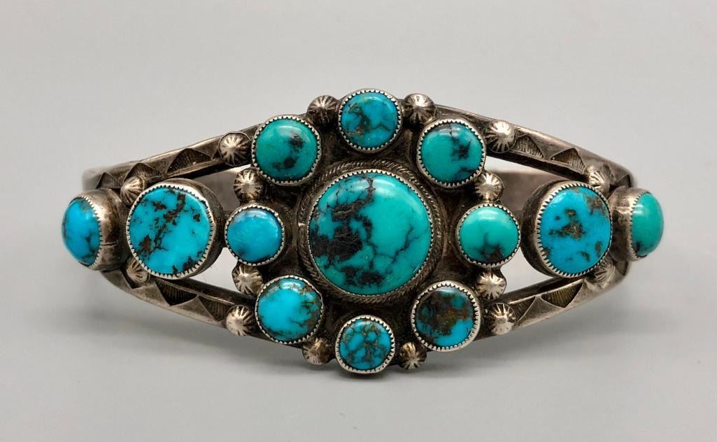 Up for consideration we have this awesome ingot turquoise cluster bracelet. This fabulous bracelet is set with 13 awesome turquoise cabochons that are in super fine sawtooth bezels. The settings are decorated with silver dots and hand stamped designs. It has a nice sturdy feel and is sterling silver. MAKER: Unmarked. APPROX AGE: Circa 1960s. SIZE: Inside circumference measures 5-1/2 inches long. Opening is an additional 1-1/8 inches, fitting a 6-5/8 inch wrist. Width 1-1/8 inches. Weighs 41.7 grams. CONDITION: Good for its age, normal wear expected. Please look closely at the pictures as they are an important part of our description and are hereby incorporated into the description, specifically with regards to condition. SHIPPING: There will be a $5 handling / packaging fee for shipping this lot. The actual cost of postage will be added on top of that. BUY IT NOW: If you would like to buy this item now, without waiting for the auction day to bid on it, we do offer this option (which is available up to 48 hours before the actual auction starts). The “Buy it Now†price is the high estimate of this lot (plus applicable fees and the Buyer's premium is discounted to 10% when using the Buy it Now option). If you would like to exercise this option, you must contact us by email (or phone as long as you talk to someone live). Reference this lot number and your intention to "Buy it Now."