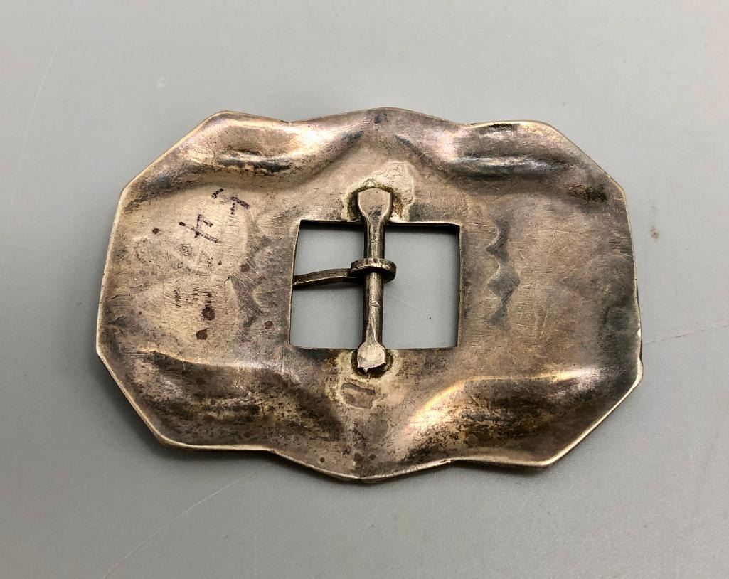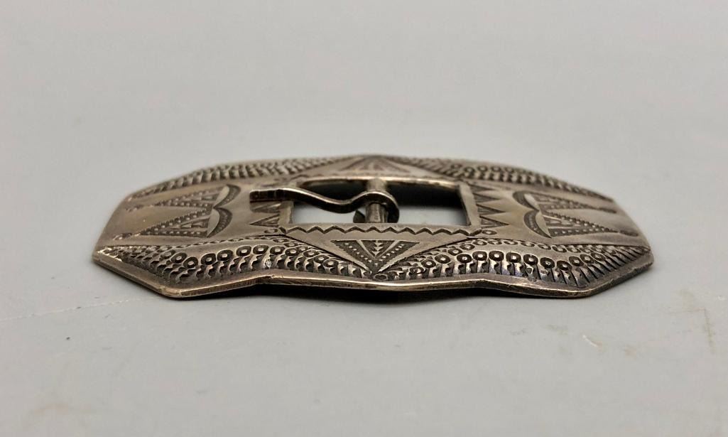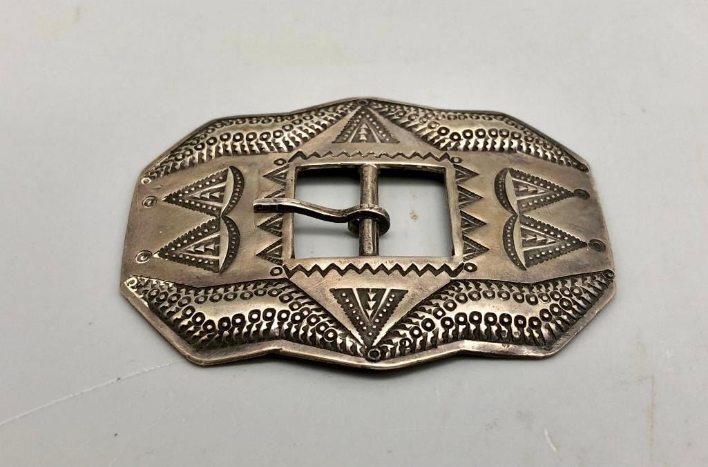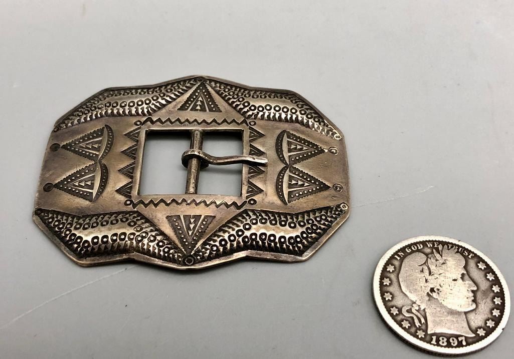 Presented for sale in this lot is an awesome repousse designed sterling silver buckle. This is an amazing belt buckle with repousse work. It does have great stamped work that really stands out. It is made from sterling silver. MAKER: Unmarked. APPROX AGE: Circa 1930s. SIZE: 2-3/8 inches wide X 1-7/8 inches tall. Fits a. 1/2 inch belt. Weighs 23.5 grams. CONDITION: Good for its age, normal wear expected. Please look closely at the pictures as they are an important part of our description and are hereby incorporated into the description, specifically with regards to condition. SHIPPING: There will be a $5 handling / packaging fee for shipping this lot. The actual cost of postage will be added on top of that. BUY IT NOW: If you would like to buy this item now, without waiting for the auction day to bid on it, we do offer this option (which is available up to 48 hours before the actual auction starts). The “Buy it Now†price is the high estimate of this lot (plus applicable fees and the Buyer's premium is discounted to 10% when using the Buy it Now option). If you would like to exercise this option, you must contact us by email (or phone as long as you talk to someone live). Reference this lot number and your intention to "Buy it Now."