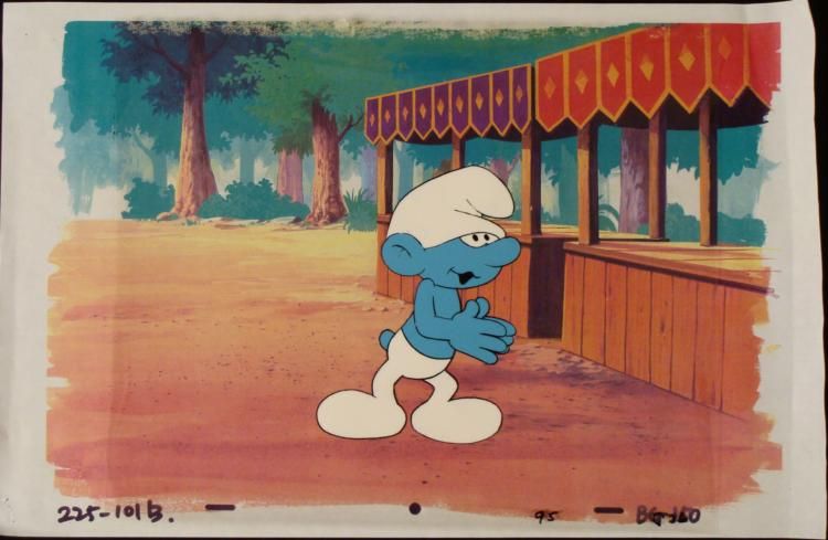 Smurfs are awesome and blue Original Animation Cel & Printed Background Medium: Hand painted acetate celDetails: Animation notations and peg holes Size of cel: 10 1/2 x 12 1/2 inchesSize of background: 11 x 17 inchesCondition: Very good This is