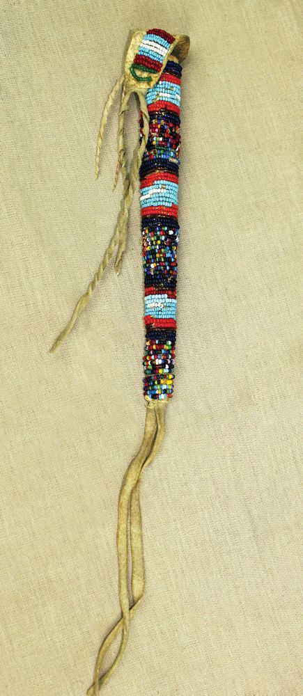 Plains awl case, measuring 7 1/2” long, fully beaded with a salt and pepper pattern.