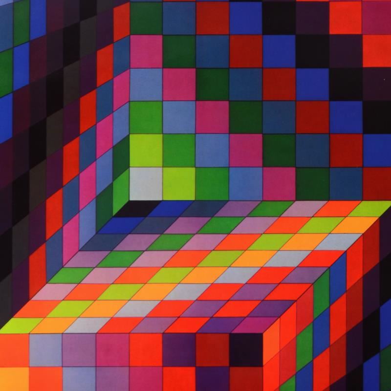 "Axo-77" is a heliogravure print on paper from the Editions du Griffon (1969) by Victor Vasarely (1908-1997). This piece is titled inverso. Measures approx. 17.5" x 31.5" (image).