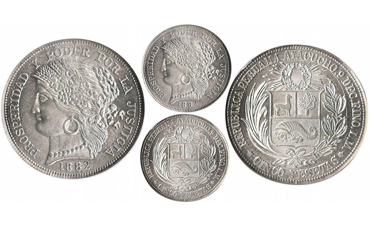Ayacucho, Peru, 5 pesetas, 1882M-LM, ex-Millennia, encapsulated NGC MS 64, finest known specimen graded by NGC. KM-201.3. Superbly lustrous and without any wear or marks at all but with typically crude surfaces (graininess and die-cracks) that plague this rare and popular 2-year type, this specimen being the finest on record and therefore of unlimited potential value to both the specialist and the trophy type-collector. Pedigreed to the Millennia collection, as stated in the slab.
