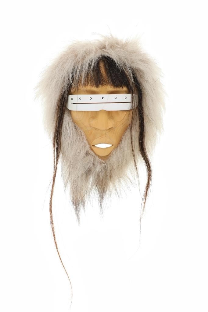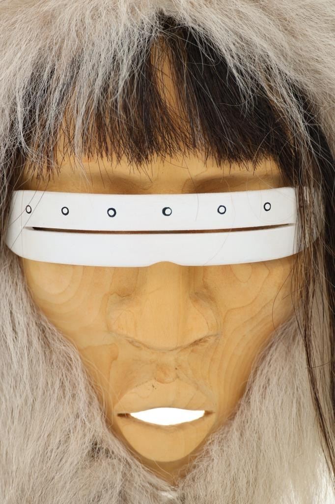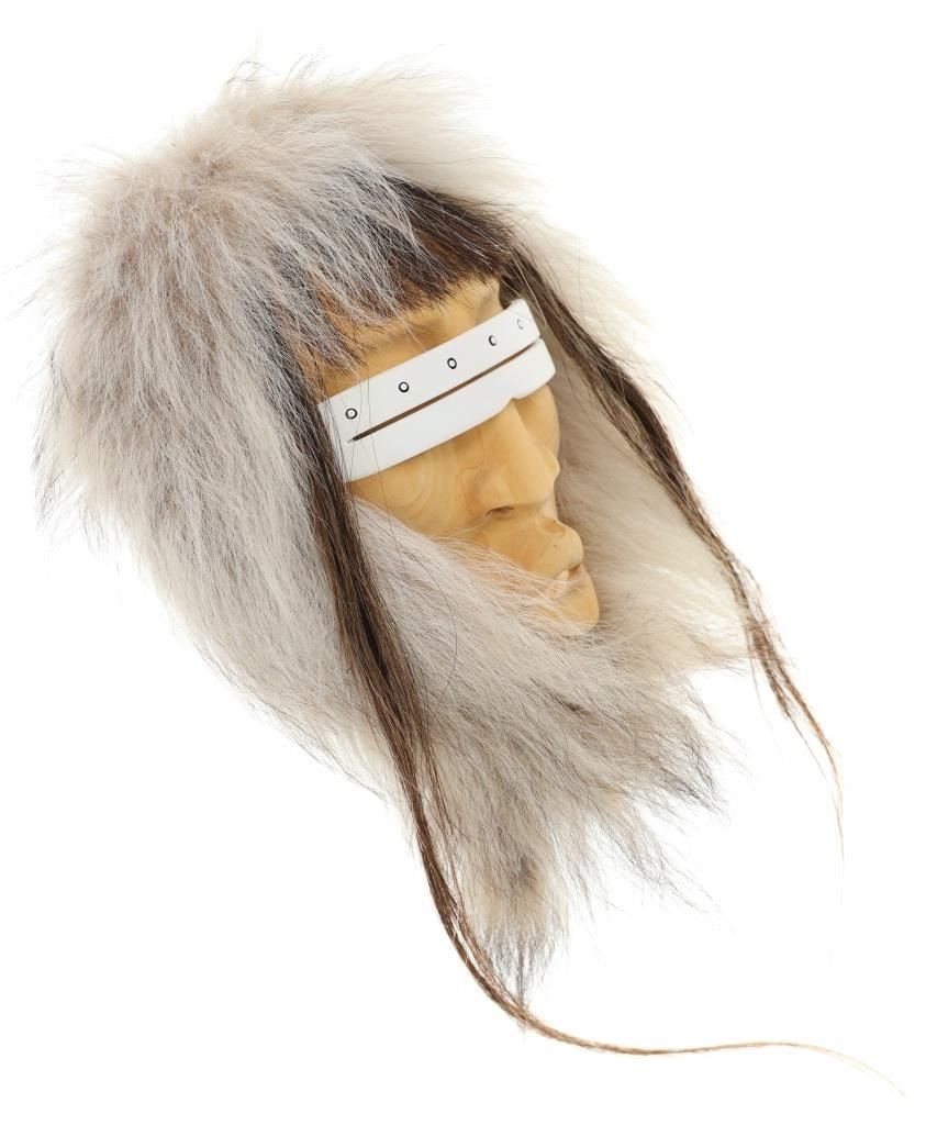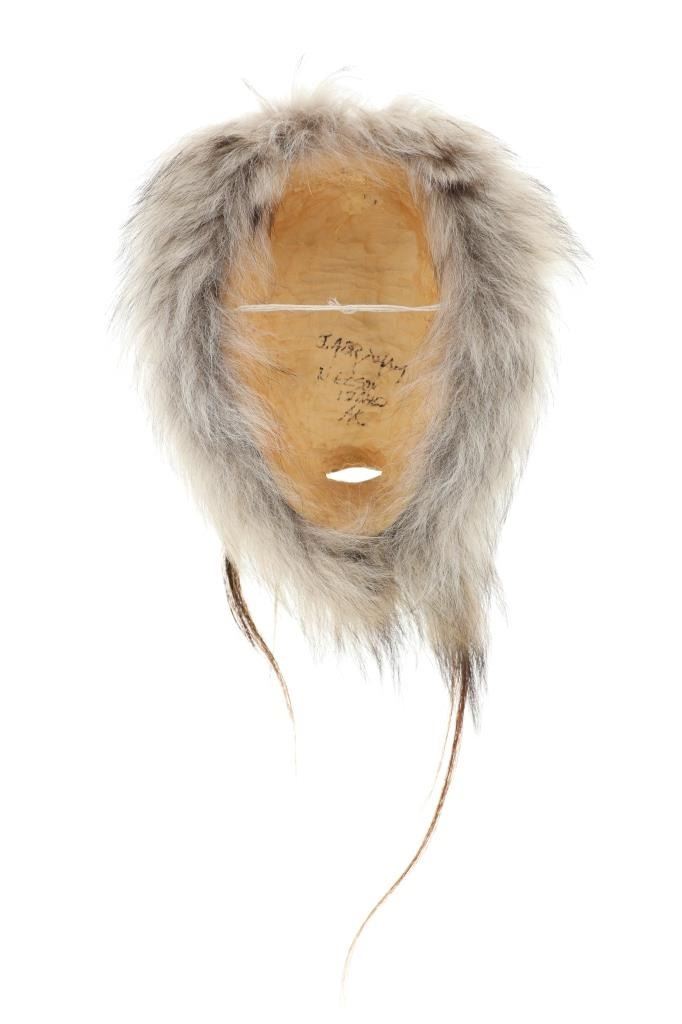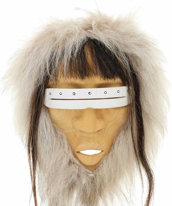 Featured in this lot is this beautiful, hand carved yellow cedar mask done by Umkumiut native, Ayap'run Jack Abraham in Nelson Island, Alaska circa 1980-90s. Jack was a self taught artist, born August 5th, 1956 in the village of Umkumiut on Nelson Island, Alaska. He started drawing at an early age, but started sculpting in his late twenties. His works of art are detailed and beautifully carved, as he has a keen attention to detail. The mask is carved from Yellow Cedar wood and is wearing white and black painted nigaugek (snow goggles) over his eyes. The mouth is slightly open and the mask is adorned with fur and long strands of horse hair. The back shows a small white string used to hang the mask or secure it by the wearer. The back also shows the artist's signature in black marker reading, "J. Abraham Nelson Island, AK". The piece shows good condition overall with little to no wear present. No signs of damage is present. The mask measures 10 1/4" L x 6 1/4" W x 3 1/2" D and weighs 15 ounces.