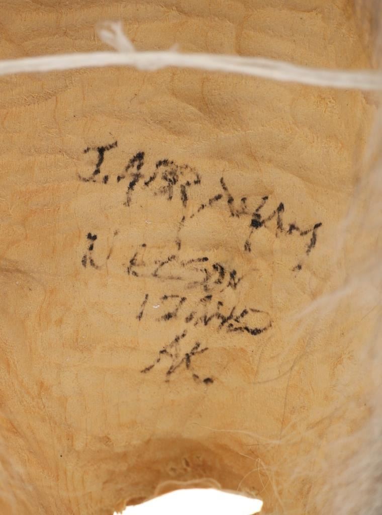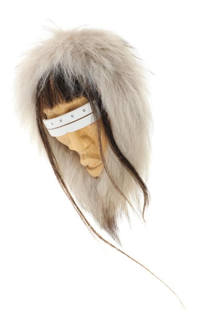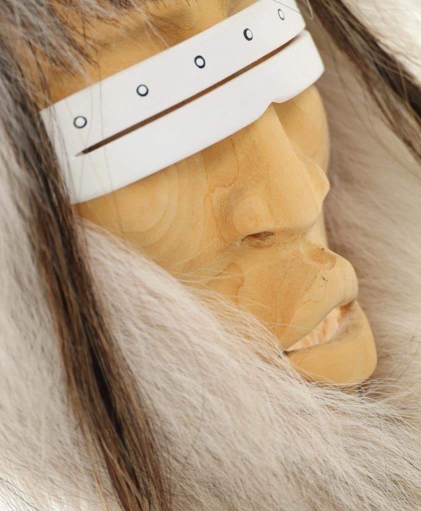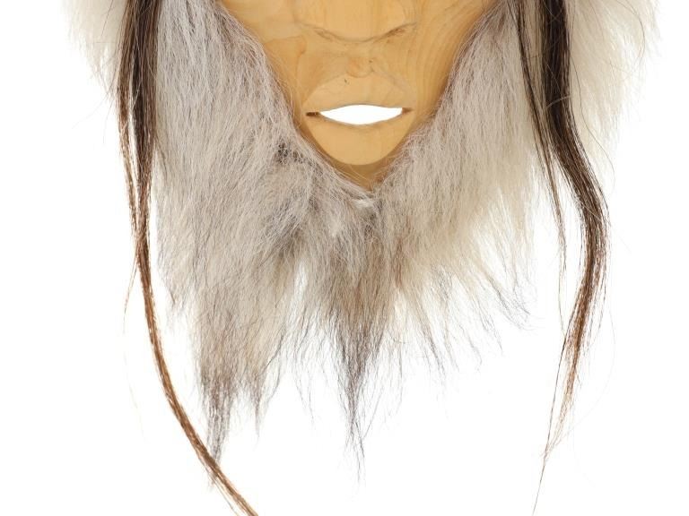 Featured in this lot is this beautiful, hand carved yellow cedar mask done by Umkumiut native, Ayap'run Jack Abraham in Nelson Island, Alaska circa 1980-90s. Jack was a self taught artist, born August 5th, 1956 in the village of Umkumiut on Nelson Island, Alaska. He started drawing at an early age, but started sculpting in his late twenties. His works of art are detailed and beautifully carved, as he has a keen attention to detail. The mask is carved from Yellow Cedar wood and is wearing white and black painted nigaugek (snow goggles) over his eyes. The mouth is slightly open and the mask is adorned with fur and long strands of horse hair. The back shows a small white string used to hang the mask or secure it by the wearer. The back also shows the artist's signature in black marker reading, "J. Abraham Nelson Island, AK". The piece shows good condition overall with little to no wear present. No signs of damage is present. The mask measures 10 1/4" L x 6 1/4" W x 3 1/2" D and weighs 15 ounces.