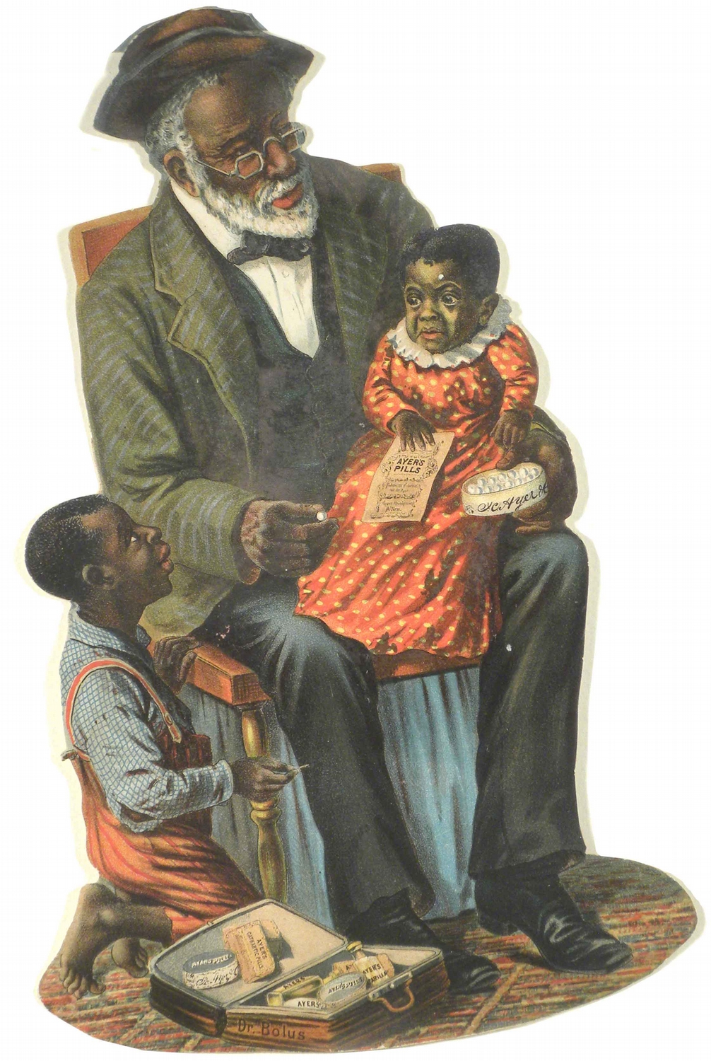 Ayer's Pills Die Cut Cardboard Easel Back Sign. Beautiful Black Americana image of "Dr. Bolus" and children. Framed under glass, near mint condition. 7 X 11 1/2 inches image only.