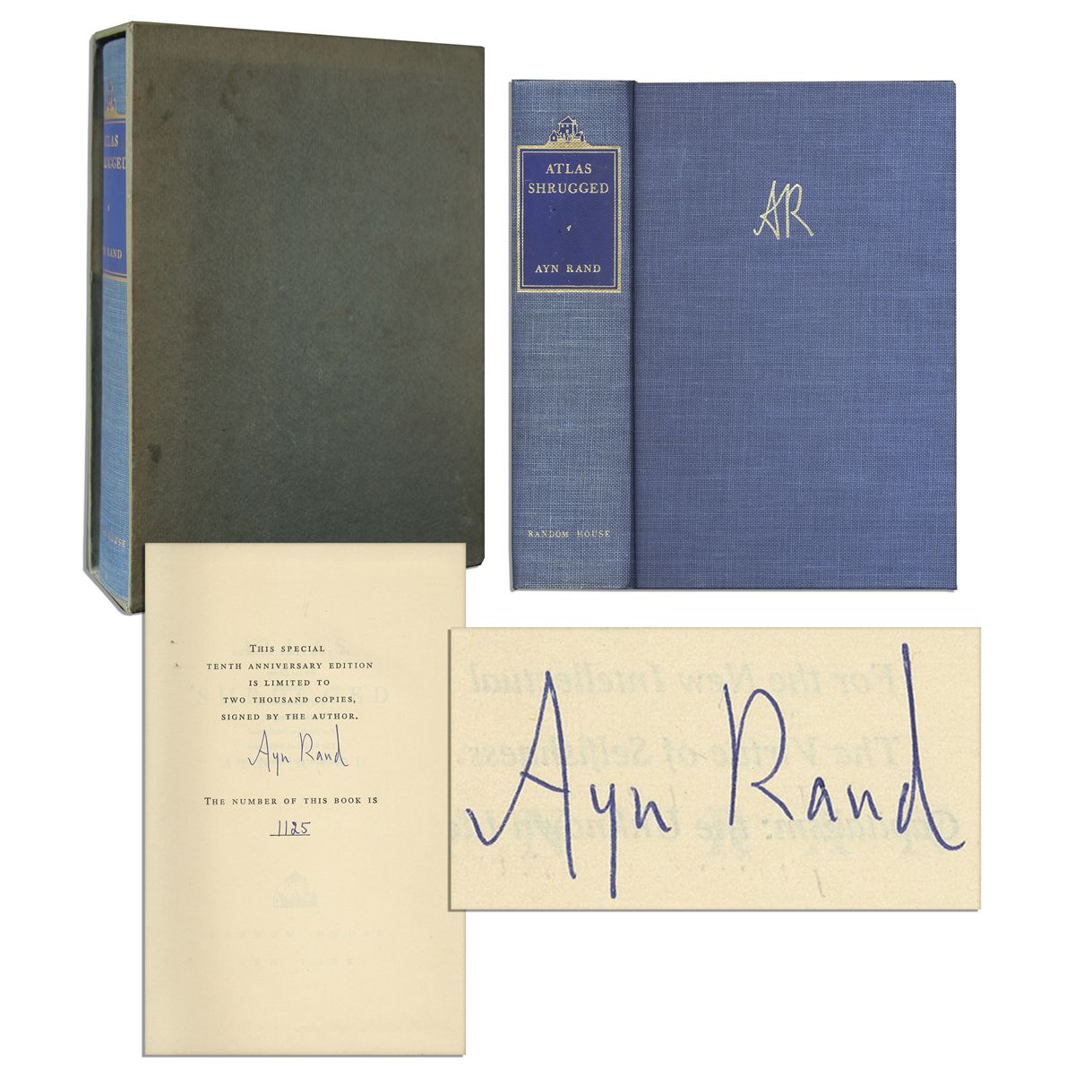 Ayn Rand signed limited edition of ''Atlas Shrugged'', Random House: New York: 1967. This is number 1125 of an edition limited to 2000. Rand's celebrated final novel set in a dystopian America popularized the philosophy of Objectivism and rational self-interest. Limitation page is signed ''Ayn Rand'' in blue ink and indicates this is number 996 of a 10th Anniversary signed edition limited to 2,000 such copies. At 1168pp., this is her lengthiest piece of literature. Bound in blue cloth boards with gilt lettering and top edge blue. Measures 6'' x 8.75''. Near fine.