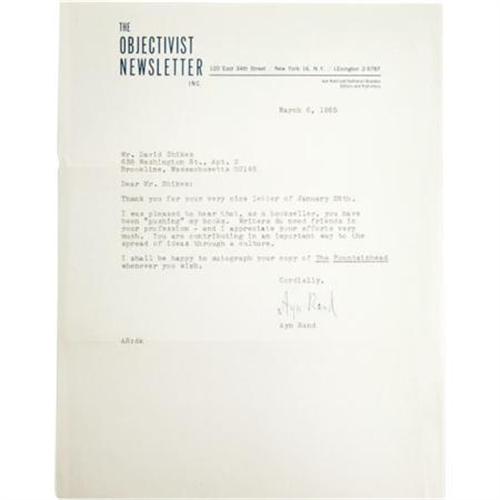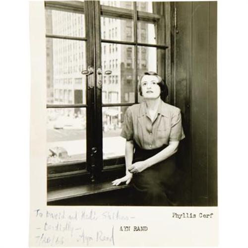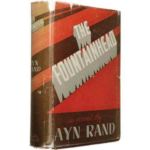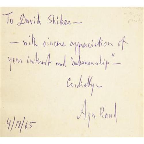 <B>Ayn Rand: Signed <I>The Fountainhead</B></I></B></I> <B>with a Typed Letter Signed and a Signed Photo</B></I> (Indianapolis New York: The Bobbs-Merrill Company, 1943), later printing, 754 pages, red cloth with gilt titles, 8vo (5.5" x 8.25"), dust jacket. Inscribed and signed "<I>To David Shikes - with sincere appreciation of your interest and 'salesmanship' - Cordially - Ayn Rand 4/18/65</B></I>" on the front free endpaper. The book is in good condition, with noticeable wear to the boards, edges, corners, and spine ends. Both inner hinges have been strengthened with archival tape, and the textblock shows some fading. Still, an early printing of Ayn Rand's classic novel signed by her. Accompanying the book is a TLS and a signed photo, both signed to the owner of the book. Both the letter and the photo are in excellent condition. A rare and wonderful lot of Ayn Rand signed material, including her literary master stroke, <I>The Fountainhead</B></I>.<BR><BR><b>Shipping:</b> Books & Catalogs (<a target="_blank" href="http://www.heritageauctions.com/common/shipping.php">view shipping information</a>)