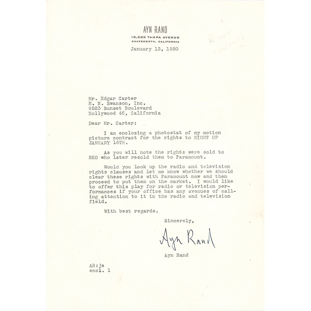 TLS, one page, 7.25 x 10.5, personal letterhead, January 13, 1950. Letter to Edgar Carter of the H. N. Swanson Agency, in part: "I am enclosing a photostat of my motion picture contract for the rights to Night of January 16th. As you will note the rights were sold to RKO who later sold them to Paramount. Would you look up the radio and television rights clauses and let me know whether we should clear these rights with Paramount now and then proceed to put them on the market. I would like to offer this play for radio or television performances if your office has any avenues of calling attention to it in the radio and television field." In fine condition.