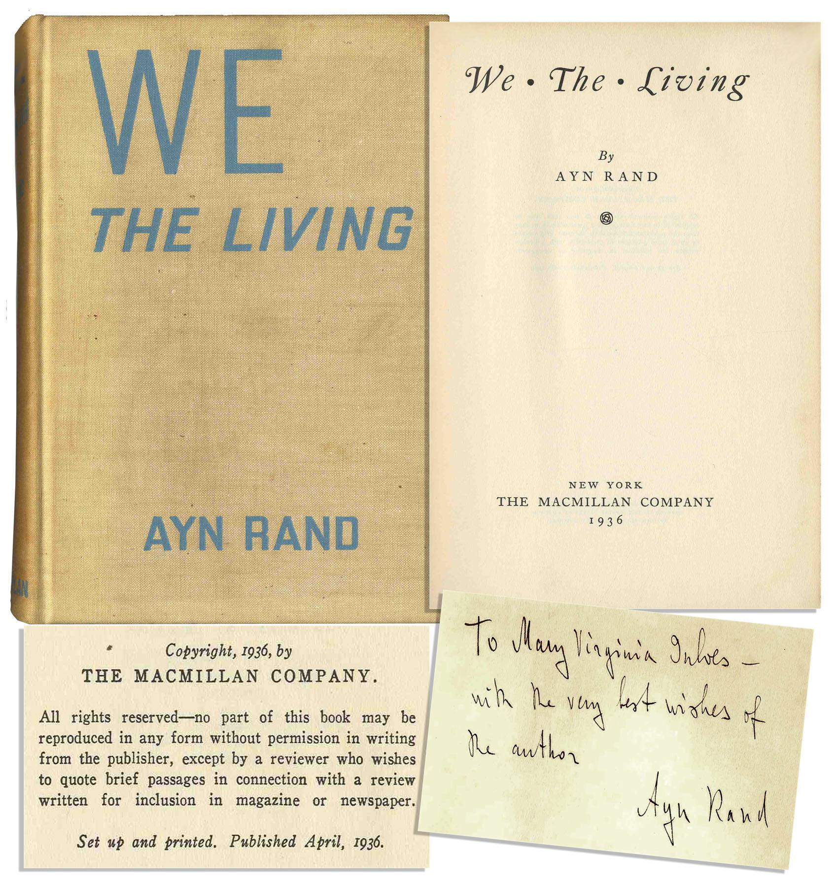 True first edition, first printing copy of Ayn Rand's ''We the Living'' signed and inscribed by the acclaimed author. Macmillan: New York: 1936. Rand inscribes the front free endpaper: ''To Mary Virginia Inholes [?] -- with the very best wishes of the author / Ayn Rand / June 17, 1936'' with an excellent, clear signature. One of only 3,000 copies printed, ''We the Living'' is Rand's first published book, and considered one of her earliest public statements against Communism. The book is Rand's closest attempt at autobiography as she mentions in the foreword, and tells the story of life in post-revolutionary Russia. With all first edition points present, including ''Published, April 1936'' on copyright page. Bound in beige cloth boards with turquoise lettering. Pages are clean and binding is tight, with only toning to edges and endpapers. Lacking a dustjacket, book measures 5.5'' x 8'' and is in near fine condition.