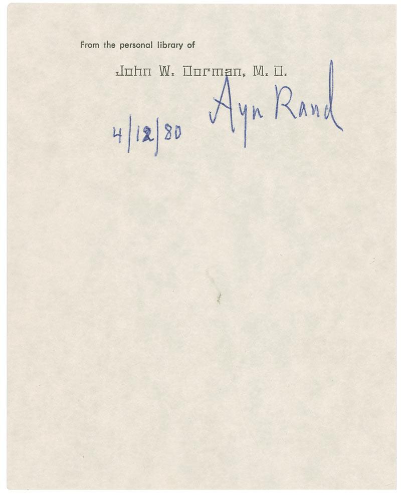 Russian-born author (1905–1982) who famously espoused an ‘objectivist’ philosophy. Her novels and philosophical works, including The Fountainhead and Atlas Shrugged, take a place among the most influential literature of the 20th century. Ballpoint signature, “Ayn Rand 4/12/80,” on an off-white 4 x 5 sheet of collector’s stationery. In fine condition.