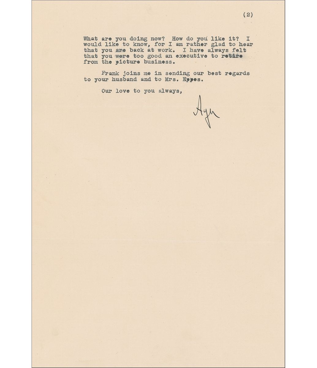 This, then, is an account of my activities. But how about you? You mention in your letter that you are working in the daytime, but you do not say where and how etc. I notice by the letter head that you must be back with Selznick International. What are you doing now? How do you like it? I would to know, for I am rather glad to hear that you are back at work. I have always felt that you were too good an executive to retire from the picture business. Frank joins me in sending our best regards to your husband and Mrs. Eppes [Marcella’s mother, Elena Epps]. Our love to you always.” Accompanied by the original mailing envelope, with Rand’s return address typed on the reverse, “A. O’Connor, 173 East 74th Street, New York, N.Y.” Rand was married to Frank O’Connor for 50 years, from 1929 until his death in 1979.They had met in 1926 when they were both extras during the filming of Cecil B. DeMille’s King of Kings. In fine condition, with a horizontal mailing fold passing through the top of first letter of signature and a few light creases.