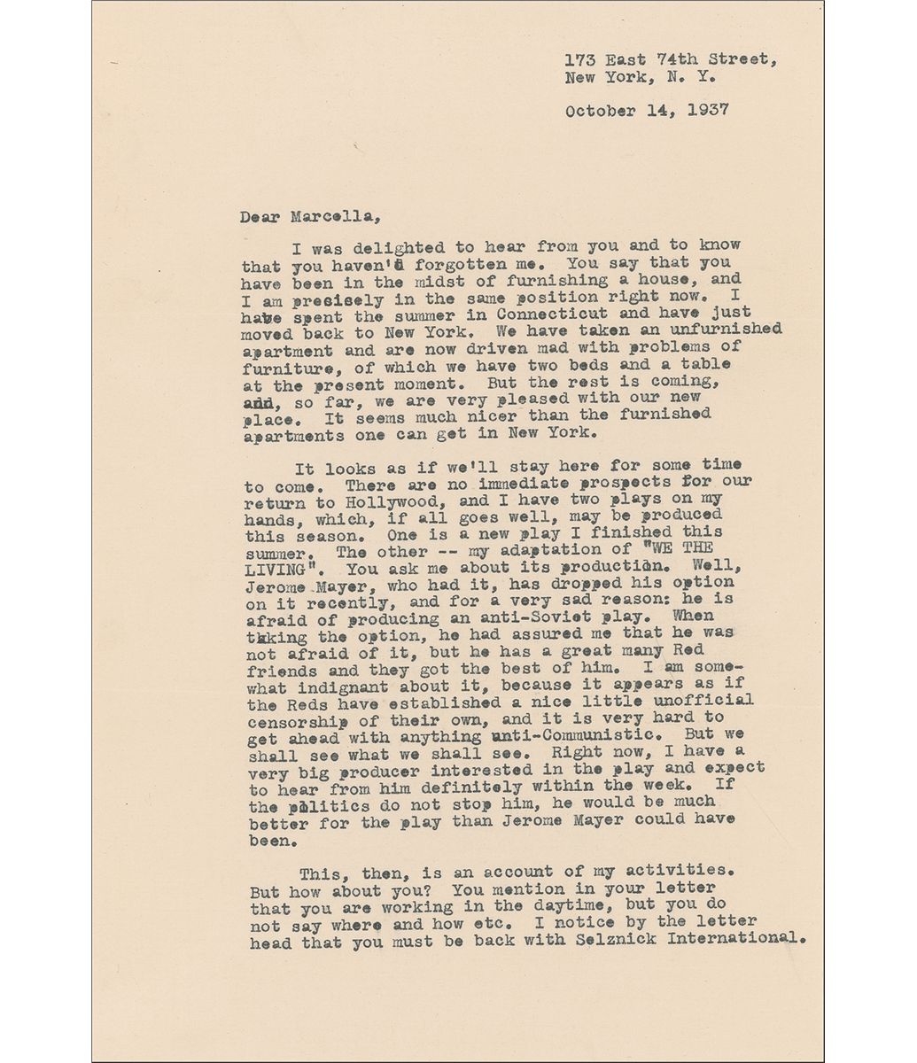 Remarkable TLS signed “Ayn,” two pages, 7.25 x 10.5, October 14, 1937. Letter to David O. Selznick’s executive assistant, Marcella Bannett Rabwin. In full: “I was delighted to hear from you and to know that you haven’t forgotten me. You say that you have been in the midst of furnishing a house, and I am precisely in the same position right now. I have spent the summer in Connecticut and have just moved back to New York. We have taken an unfurnished apartment and are now driven mad with problems of furniture, of which we have two beds and a table at the present moment. But the rest is coming, and, so far, we are very pleased with our new place. It seems much nicer than the furnished apartments one can get in New York.