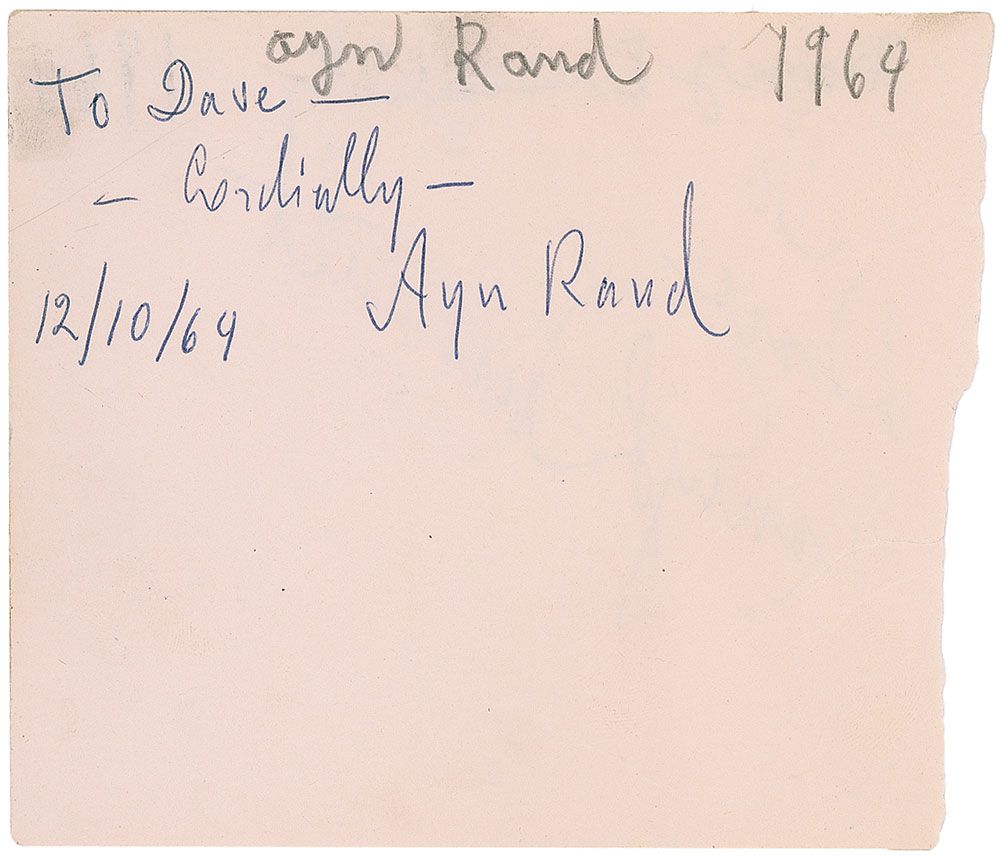 Vintage ballpoint signature and inscription, “To Dave—Cordially—Ayn Rand 12/10/64,” on an off-white 5 x 4.5 album page with a collector’s pencil notation above inscription. In fine condition, with some scattered light creasing, wrinkling, and soiling.