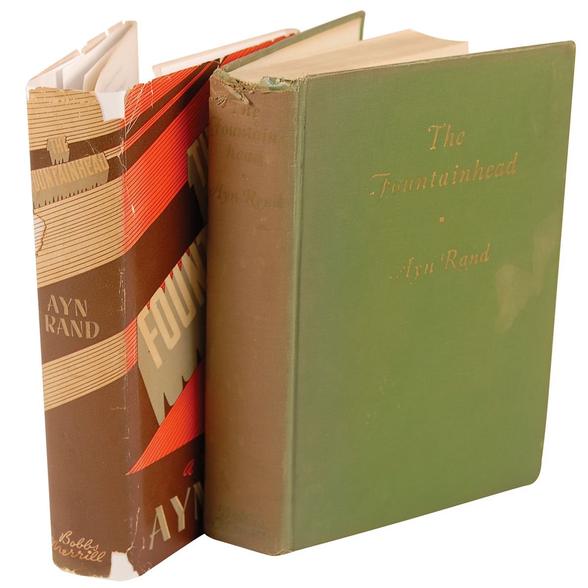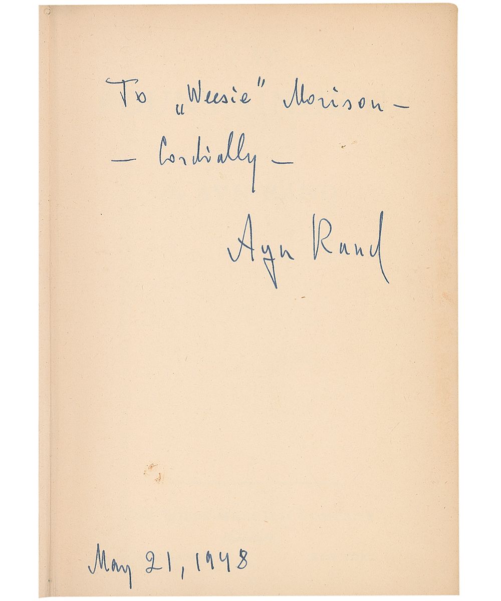 Signed book: The Fountainhead. First edition, second issue (in green cloth; printed two months after the first). Indianapolis: Bobbs-Merrill Company, 1943. Hardcover, 6 x 8.25, 754 pages. Signed and inscribed on the first free end page, “To ‘Weesie’ Morrison—Cordially, Ayn Rand, May 21, 1948.” Housed in a slightly trimmed jacket from a modern printing. Front hinge cracked and partly separated (still held by webbing), light staining to covers, sunning to spine and chipping to ends, and a hint of subtle soiling and a faint spot or two to signed page (not affecting writing), otherwise very good condition. Scarce in signed first-edition copies.