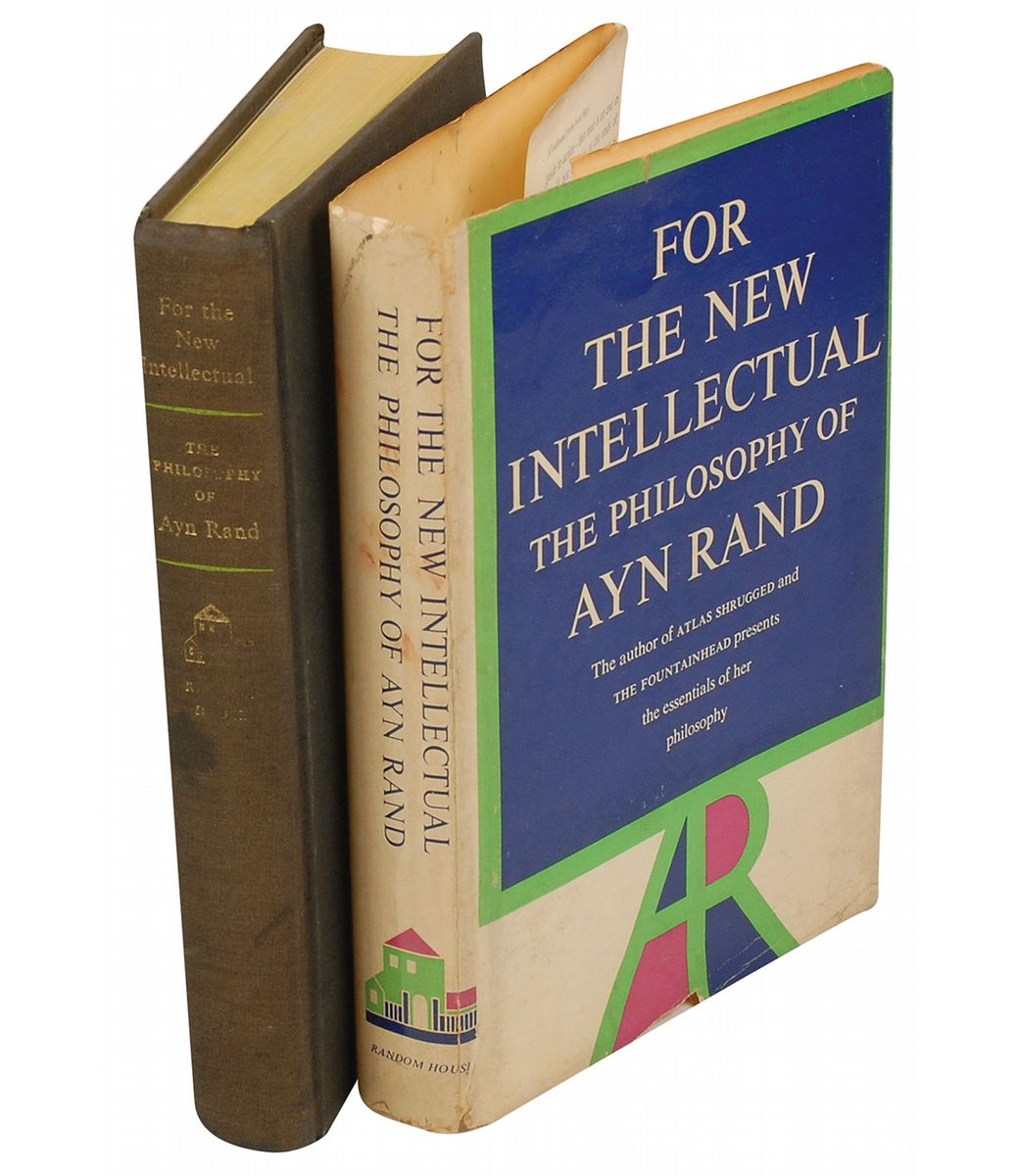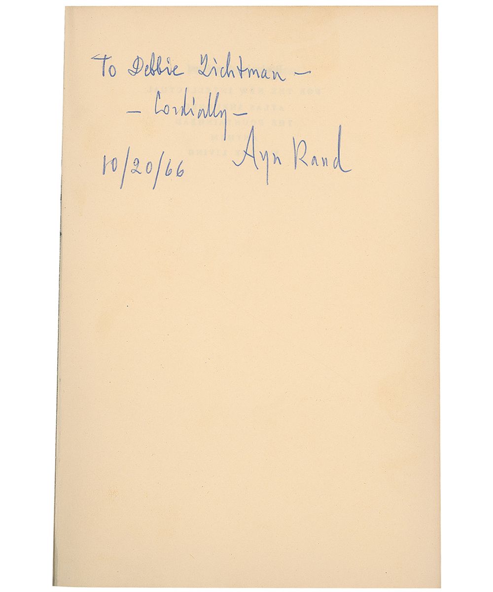 Signed book: For the New Intellectual: The Philosophy of Ayn Rand. Later printing. NY: Random House, 1961. Hardcover with dust jacket, 5.5 x 8.5, 242 pages. Signed and inscribed on the second free end page, “To Debbie Lichtman—Cordially—Ayn Rand, 10/20/66