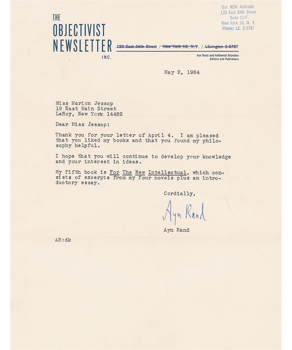 TLS, one page, 8.5 x 11, The Objectivist Newsletter letterhead, May 2, 1964. In part: “I am pleased that you liked my books and that you found my philosophy helpful. I hope that you will continue to develop your knowledge and your interest in ideas. My fifth book is For The New Intellectual which consists of excerpts from my four novels plus an introductory essay.” The address at the top has been crossed out and a stamp of the new address has been applied to the top right corner. In fine condition. Accompanied by the original mailing envelope.