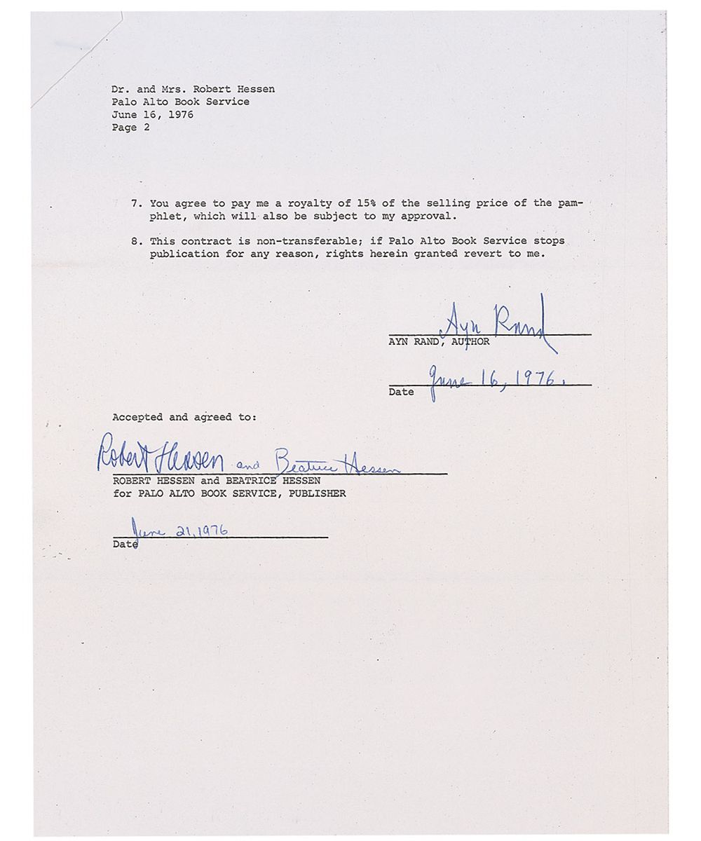Uncommon DS, two pages, 8.5 x 11, The Ayn Rand Letter, Inc. letterhead, June 16, 1976. An agreement between Rand and the Palo Alto Book Service to publish the text of her lecture, ‘The Moral Factor,’ given at the Ford Hall Forum on April 11, 1976. In part: “This is to give to the Palo Alto Book Service permission to publish ‘The Moral Factor’—subject to the following conditions: 1. The lecture must be published in full without any cuts or changes of any nature whatsoever. 2. The lecture must be published as a pamphlet of the same format as that previously used by The Objectivist, Inc. 3. The proposed layout for the pamphlet must be sent to me for my prior approval.” Signed in blue ballpoint on the second page by Ayn Rand and countersigned by Robert and Beatrice Hessen. In fine condition, with expected document wear. In The Moral Factor, Rand wrote some of her philosophy regarding war and oppressive governments.