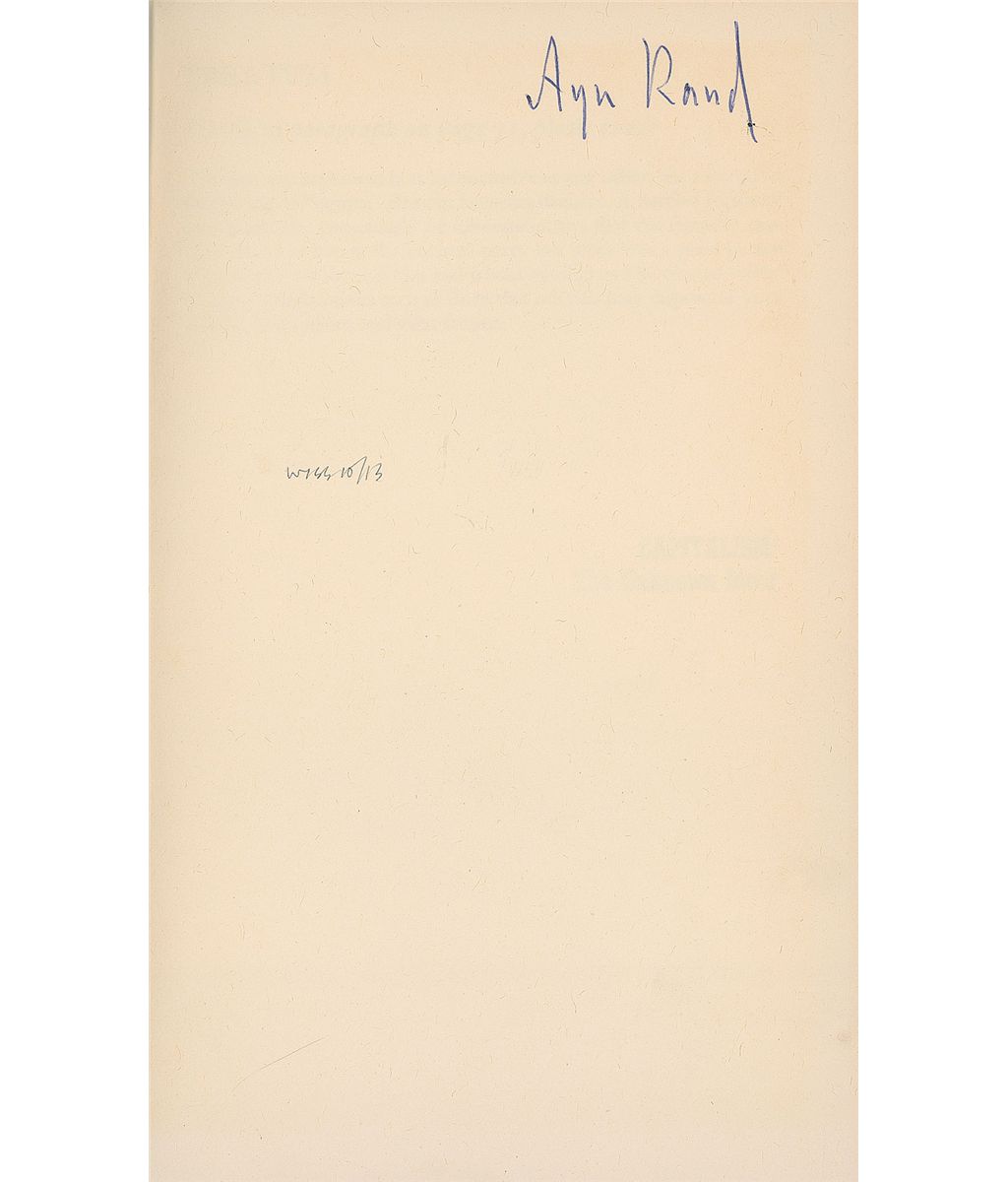 Signed book: Capitalism: The Unknown Ideal. First edition, first printing. NY: New American Library, 1966. Hardcover, 5.75 x 8.5, 309 pages. Signed on the second free end page in blue ballpoint. Autographic condition: fine, with a mild shade of toning to signed page. Book condition: VG+/None.