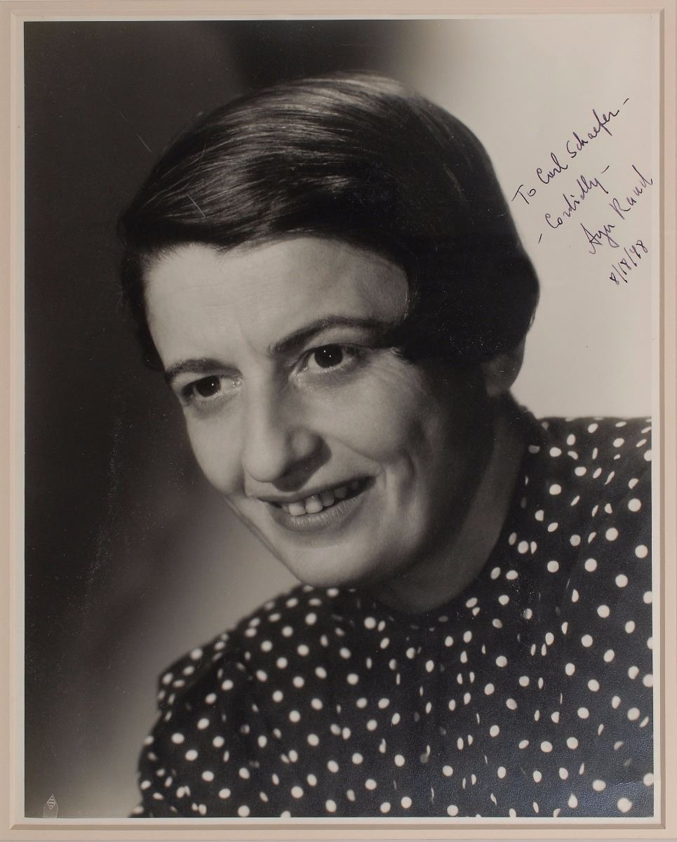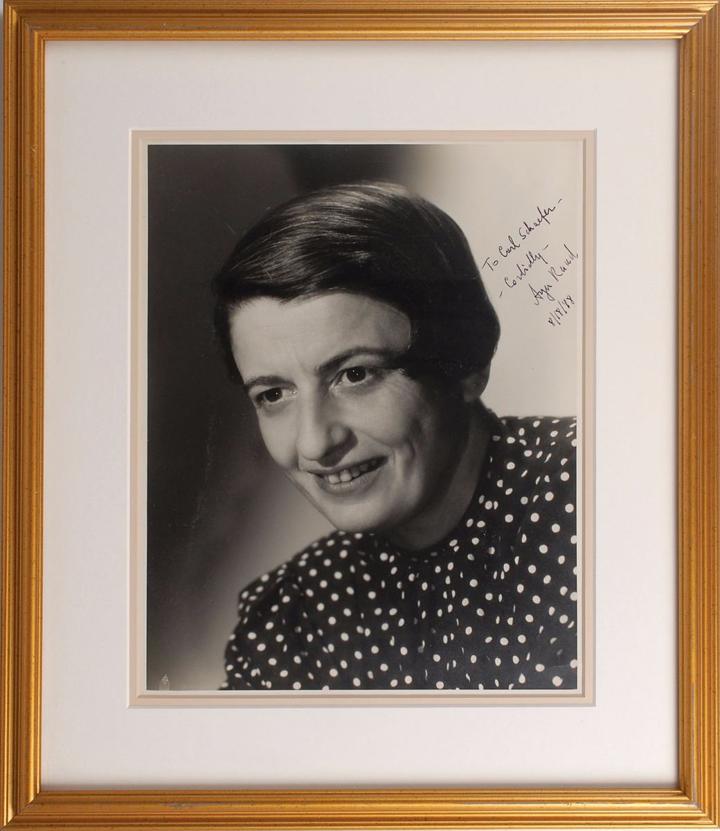 Extraordinarily rare matte-finish 10.75 x 13.75 portrait of Rand, nicely signed and inscribed against the light background in fountain pen, “To Carl Schaefer—Cordially—Ayn Rand, 8/18/48.” Handsomely double-matted and framed to an overall size of 17.5 x 20.5. In fine condition. In 1943 Rand had published The Fountainhead, her first work to espouse the philosophy of Objectivism that came to characterize her later work and legacy. The novel was a New York Times bestseller by 1945, and when she signed this photo the production for a Fountainhead film starring Gary Cooper had just begun. Rand was also deep in research for her magnum opus, Atlas Shrugged, which would be published nearly a decade later in 1957. Signed photos of Rand are practically unknown, and this superb oversized example is certainly one of the finest extant.