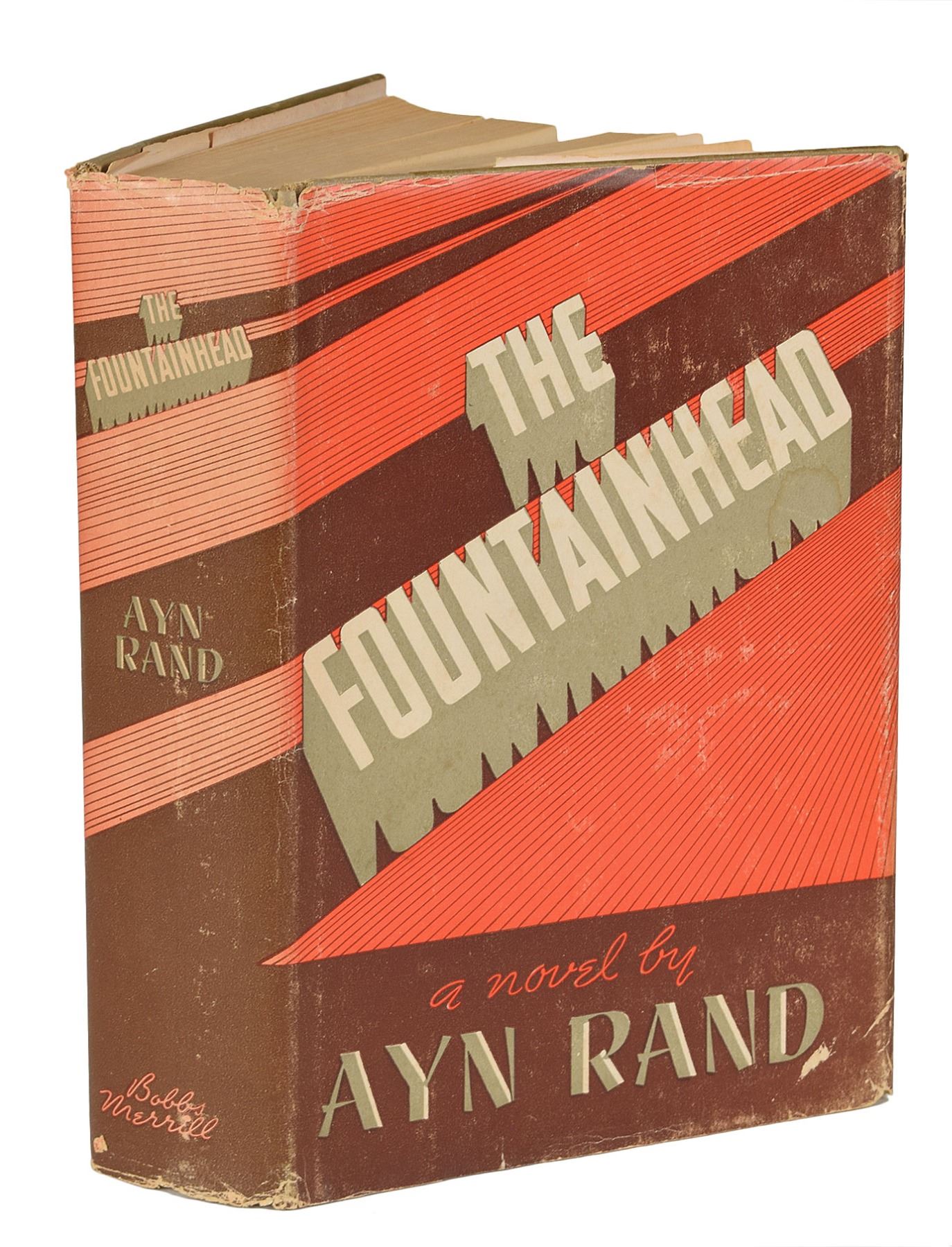 Signed book: The Fountainhead. Later printing. Indianapolis: The Bobbs-Merrill Company, 1964. Hardcover with dust jacket, 6.25 x 8.5, 754 pages. Signed on the first free end page in blue ballpoint, "Ayn Rand, 1/17/66." Autographic condition: fine, with light toning and a former owner's bookplate in the center of the signed page. Book condition: VG-/VG, with toning and edgewear, ownership inscription removed from title page, some creasing to pages, and mild dampstaining to textblock edges; the dust jacket has chipping to edges and a sunned spine.