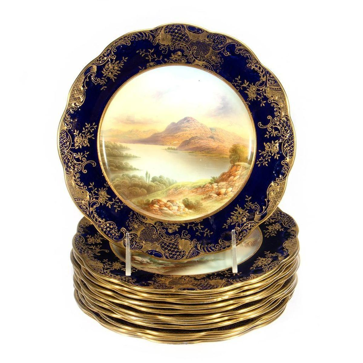 A set of twelve with views of Great Britain's vistas within a gilt and cobalt border. 8 1/2in. diameter. Condition: Very minor scratches on a few plates at center.