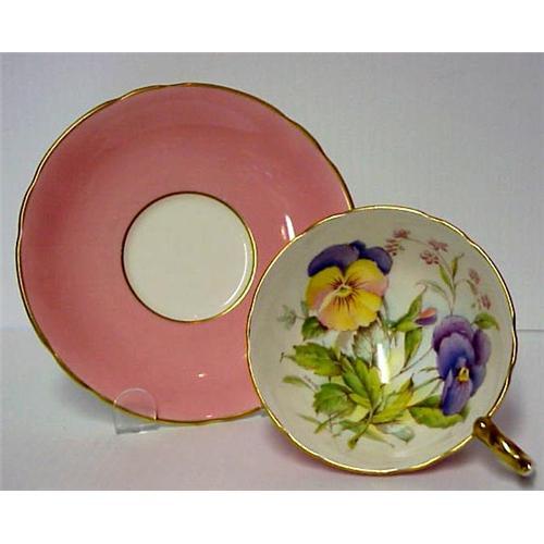 This is A MASTERPIECE of hand painted cup & saucer set - Made by Aynsley, England and signed S.Bentley - Golden pedestal and fresh,lovely peachy pink color on outside, inside of the cup displays 2 gorgeous pansy blossoms - This is one of the large wide open wonderful cup - Very good condition - Free of damage