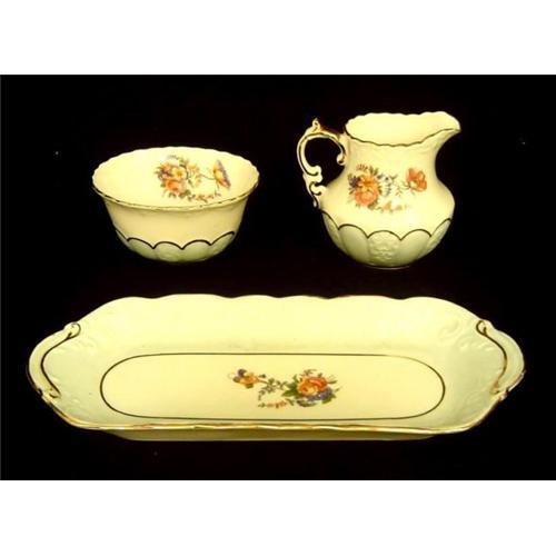 Circa. 1940-1945 The sugar measures 1.75 inches high, 2.75 inches deep and 3.50 inches wide. The Creamer measures 3 inches high, 3.50 inches wide, and 1.75 inches deep. The tray is 8.5 inches wide, 3.75 inches deep and .75 inch high. All in very good condition.