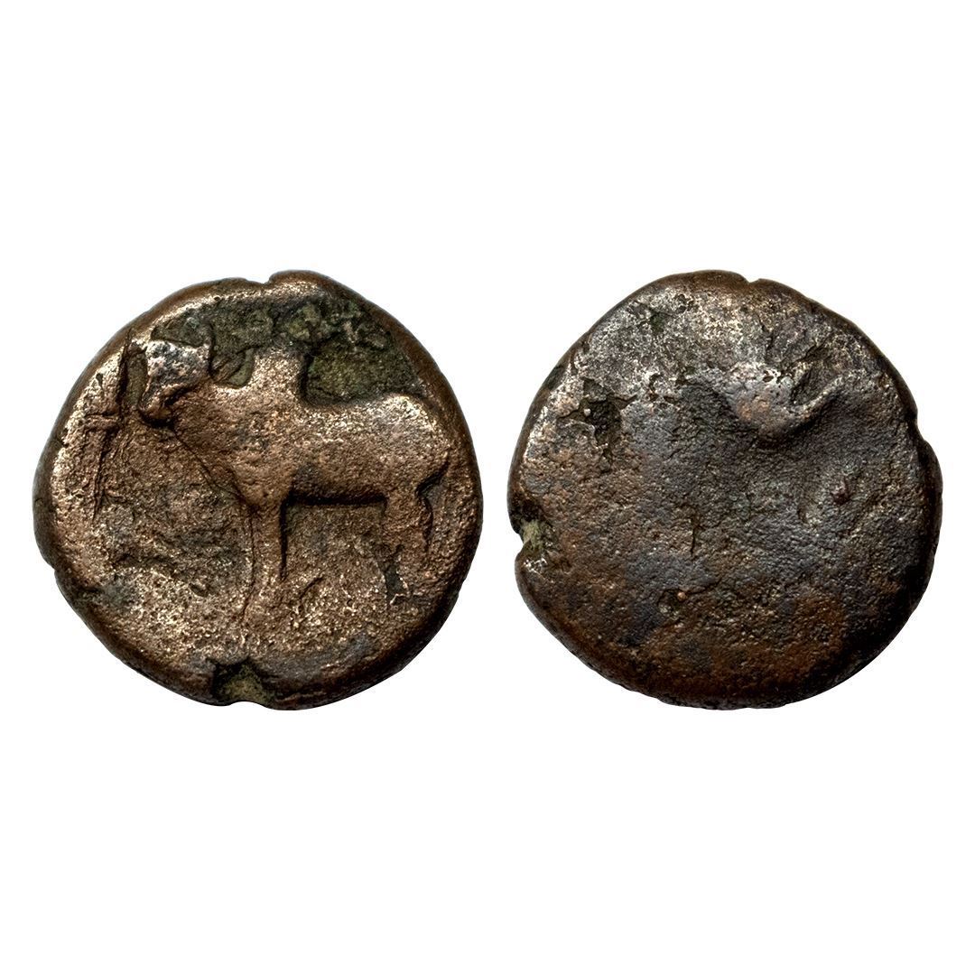 Ayodhya Region, (1st Century BC), Copper Unit, 7.71 gms, Obverse: A bull to left facing a standard, traces of Brahmi legend below reading, Reverse: A rooster facing a Palm tree, fine, rare.