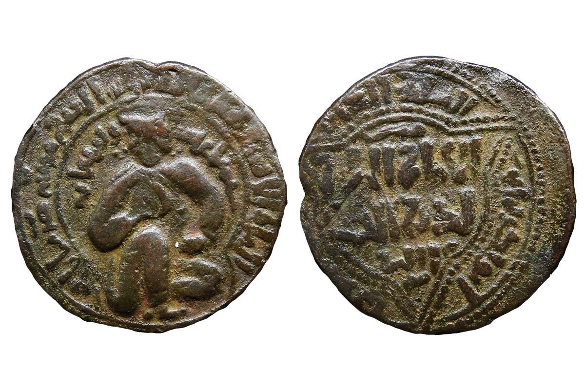 Ayyubids of Mayyafariqin & Sinjar, Al-Ashraf I Muzaffar al-din Musa (1210-1220 AD / AH 607-617), Heavy Copper Dirham, 12.20 grams, Mayyafariqin Mint, present-day Turkey, Obv. Turbaned Prince seated with the right leg drawn up and holding an orb in the right hand with his left hand on his hip, the words al-Malik al-Ashraf and shows the date as 621 AH, Rev. A triangular shield with convex side and what looks like ears composed of a plain line in a dotted line with writing around it and within it. The legend around the shield read “Al malik al-Adil Saiff al-Din Abu Bakr ibn Ayyub”. (Album 859.1, Balog 849), Very Fine, Rare.