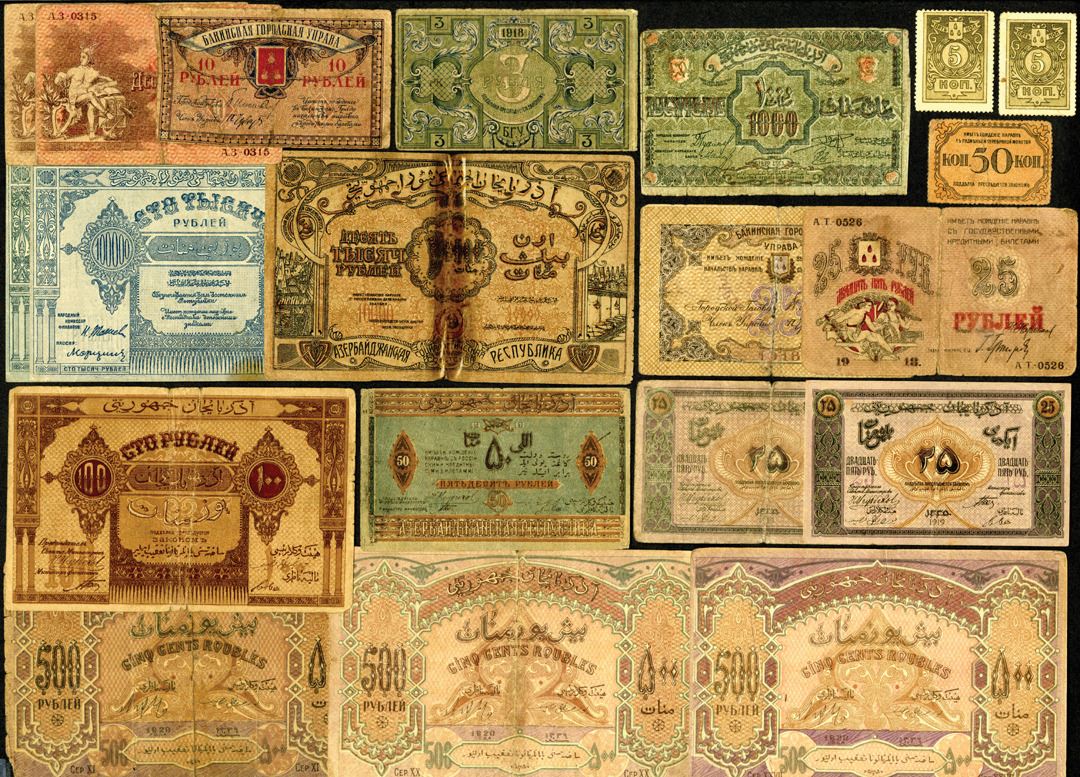 Azerbaijan, Lot of 20 notes from Azerbaijan as an autonomous republic as well as under the Russia as a Soviet Socialist Republic. Includes from the 1919 First Issue 25 Rubles, P-1 (2 pcs); 50 Rubles, P-2; 100 Rubles, P-5; 500 Rubles, P-7 (3 pcs). Also included are Russia 1000 Rubles, 1920, P-S712; 3-10-25 Rubles, 1918, P-S722, S723, S724; 10000 Rubles, 1921, P-S714; 100000 Rubles, P-S717 (2 pcs); and finally from the Baku City Management 5 Kopeks, P-S726 (2 pcs); 50 Kopeks, P-S728; as well as 10 Rubles, S-731 (2 pcs), and 25 Rubles, S-732. VG to VF Condition. Sold "AS IS", No returns accepted. (20)