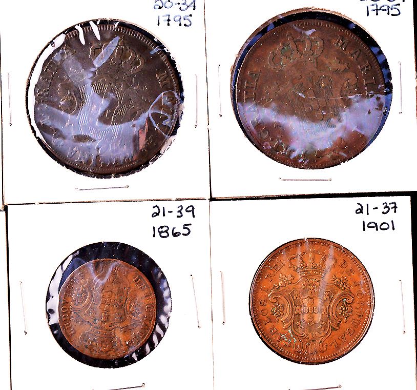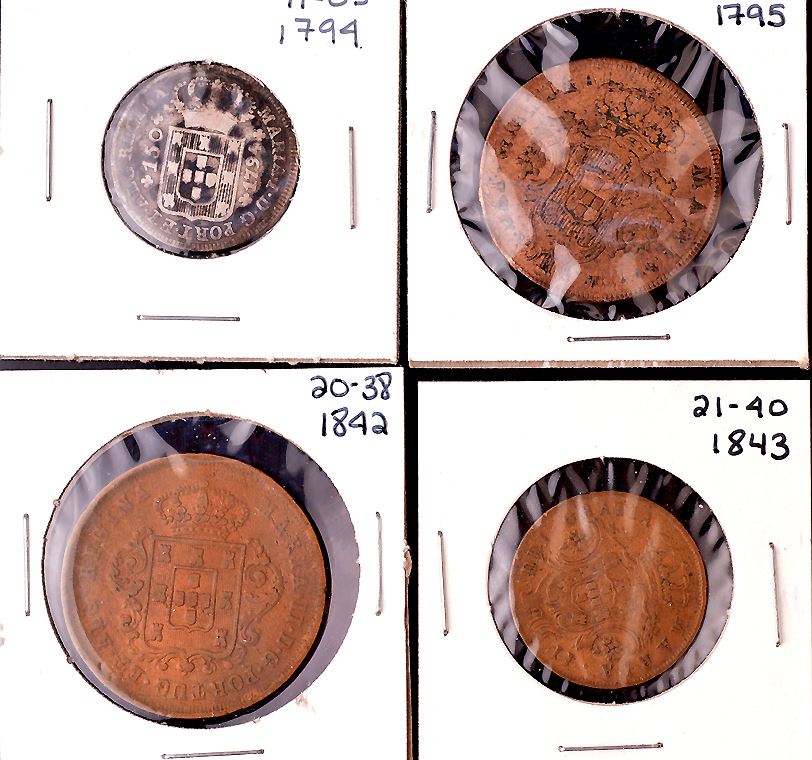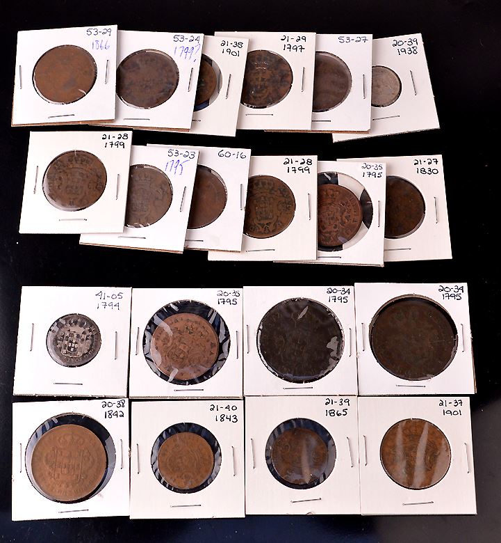 Portuguese Colonial : Azores, coin group: 5 Reis, 1795; 1797; 1799; date unreadable, Maria I, (2), KM#9; 1843, KM#10; 1865, KM#13; 1901, KM#16, corrosion; 10 Reis, 1795, (2), KM#5; 1866, KM#14; 1901, KM#17; 20 Reis, 1795, KM#3, (2); 150 Reis, Silver, 1794, KM#7; Terceira Island, 5 Reis, 1830, KM#5; Madeira Islands, 10 Reis, 1842, KM#2; Mozambique, 2.50 Escudos, 1938, KM#68; Filler to VF, most Good to Fine, total of 20 pcs.