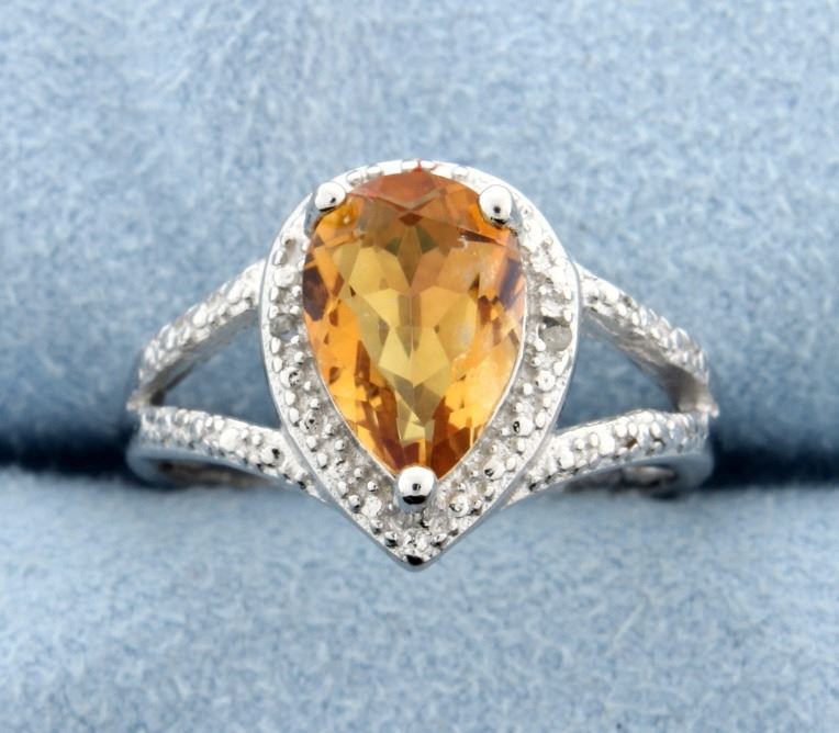 Magnificent sterling silver split shank ring with Halo style and gorgeous genuine pear cut Azotic Topaz at the center and accented with 0.01 carats of diamonds 3.1g Size 7