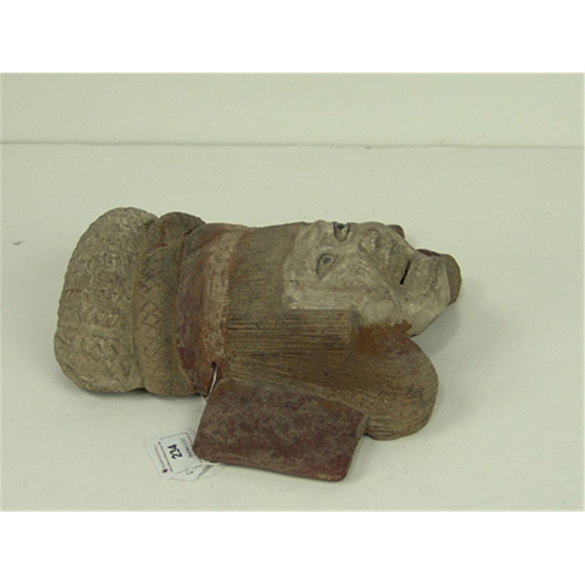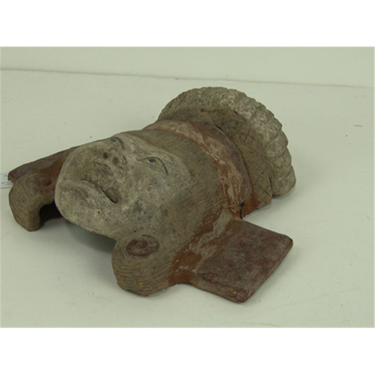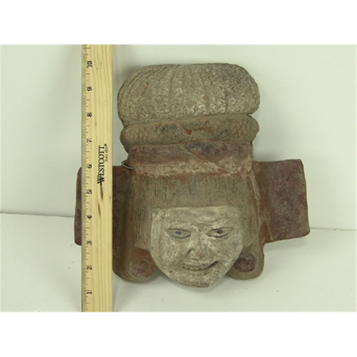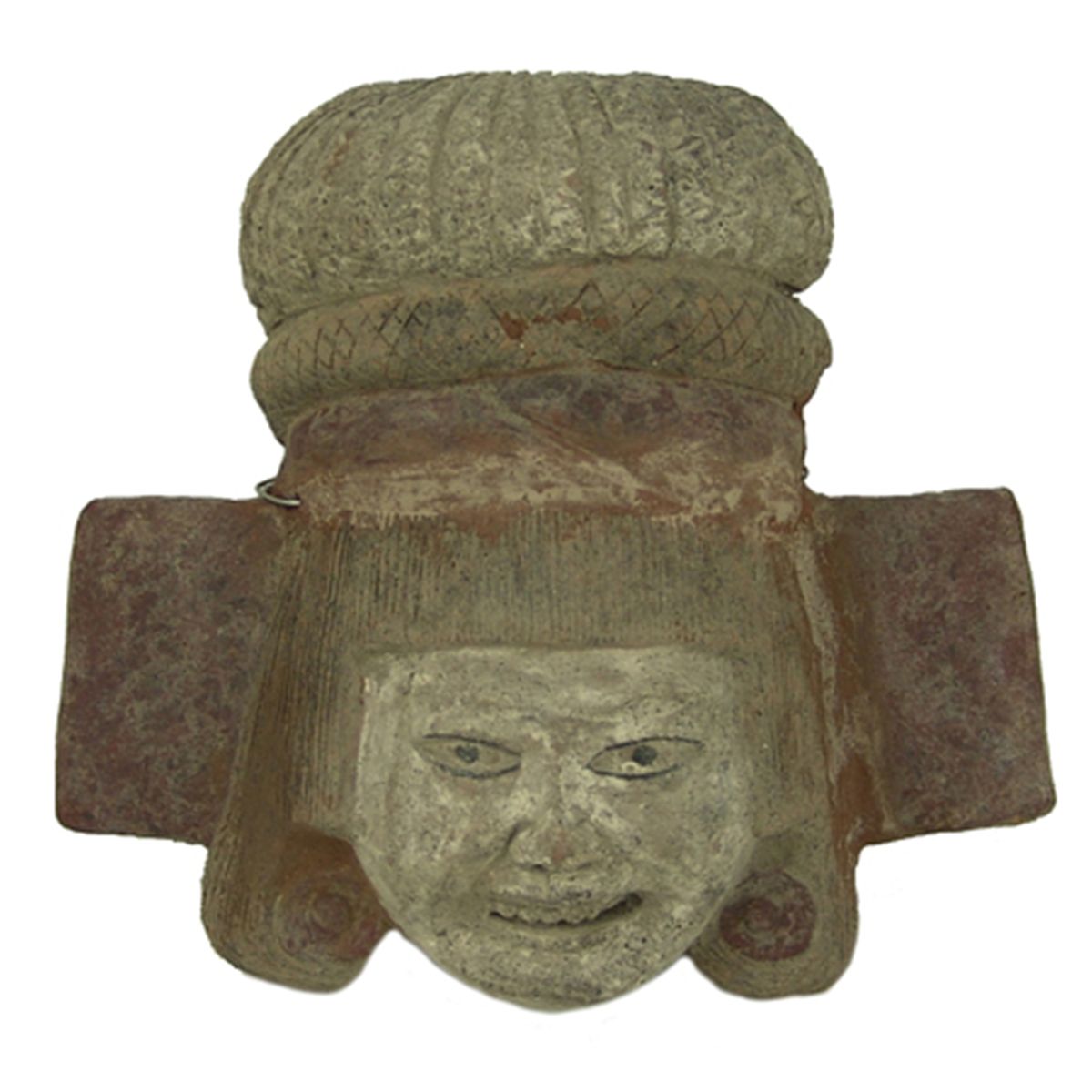 Traditional old style pottery wall mask, a human face with large headdress. Very good condition, crack on one ear. Circa: Late 1900s Size: 10" x 9"