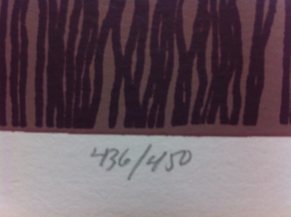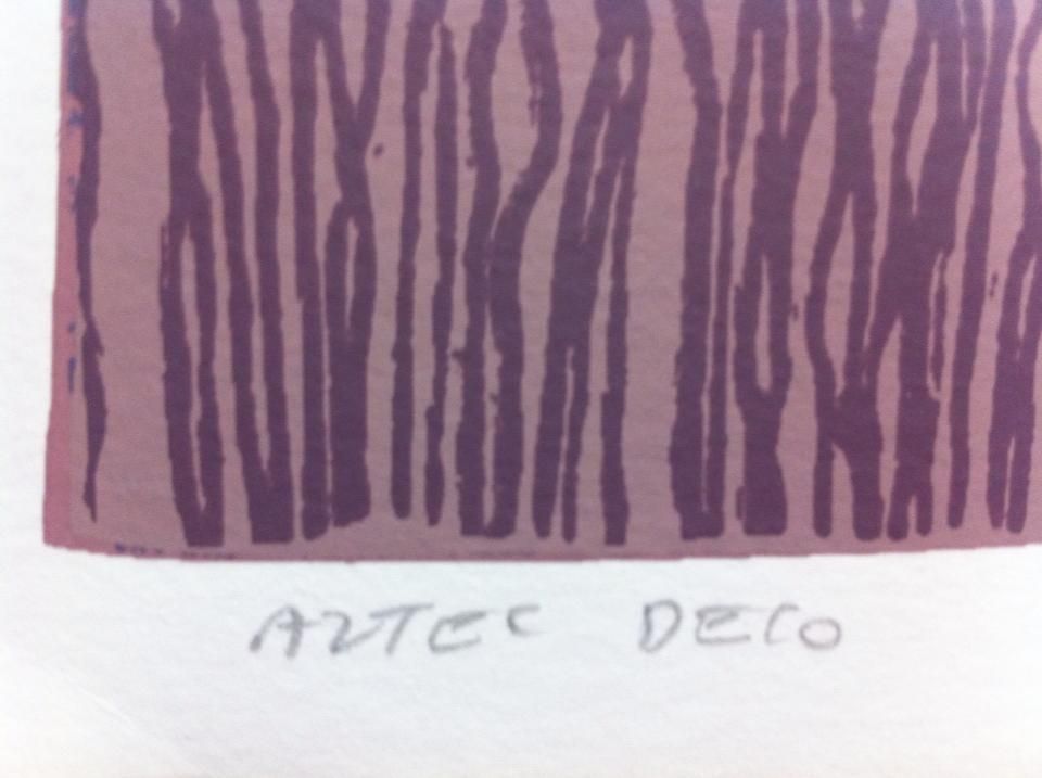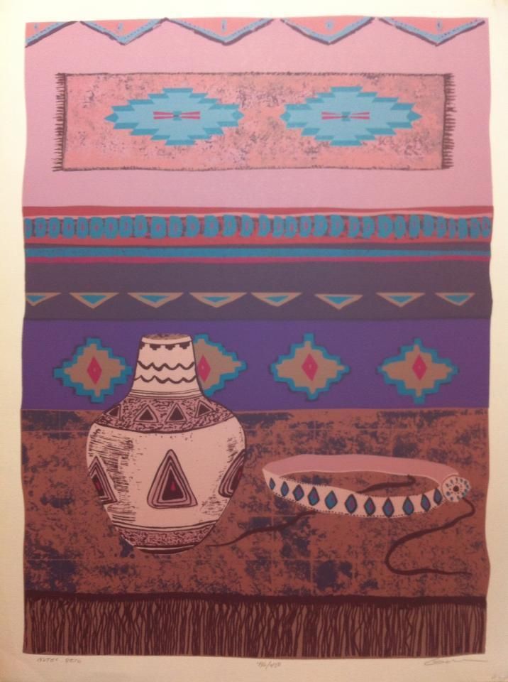 "Aztec Deco" hand signed by artist Gore Numbered 436/450 Image size: 15 1/2" x 21" size: 17 1/2" x 23" This is for a hand signed, and numbered print titled "Aztec Deco" by the artist Gore. This print features a brightly decorated woven rug, and two Native American pottery pieces among the vibrant colors.
