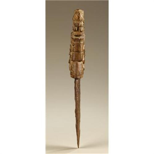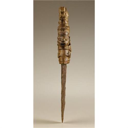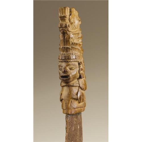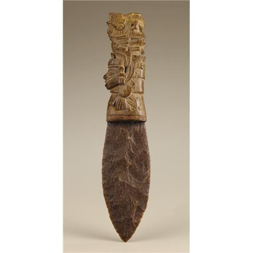 <B>Knife with Carved Wood Handle</B></I><BR>Aztec-Mixtec<BR>A.D. 1300 - 1521<BR>Wood and Chert, Weight 38 grams<BR>Height 13 in. Width 1 1/2 in.<BR><BR>The crisply carved wooden handle is connected to a broad chert blade of deep reddish brown color. The handle's primary image is a half figure whose open mouth suggests someone singing or chanting. An elaborate, frame-supported headdress backs this figure. It is possible that the entire unit represents an effigy such as would have been found in a shrine. Absolute iconographic identification is elusive, but the principal figure's facial expression and limply hanging hands make Xipe a likely identification. Xipe is an ancient deity, probably originating among early Gulf Coast agriculturalists. His primary meaning is as the flayed god of spring and regeneration. By Aztec-Mixtec times he was also patron of goldsmiths and jewelers. Here it is of note that the most likely identification of the headdress creature is Xiuhcoatl, the fire serpent. Robert Sonin, in a letter of 10 December 1982, cites a line from a hymn to Xipe that is of relevance: "The serpent of fire has set me free" (Laurette Séjourné. <I>Burning Water. Thought and Religion in Ancient Mexico.</B></I>New York and London: Thames & Hudson, 1956, p.151). The condition is very good. It is probable that the handle and blade, both ancient, have recently been put together.<BR><BR>The lot is sold with a statement of authenticity from the distinguished expert Robert Sonin.<BR><BR>Provenance<BR>Leonard Patterson, New York<BR>David Bernstein, New York<BR><BR>