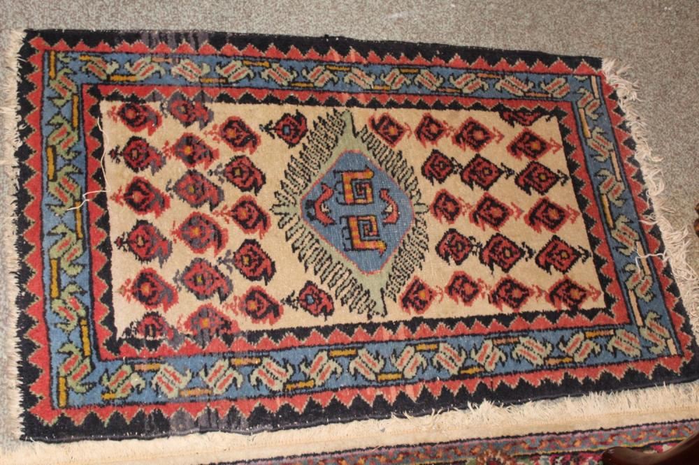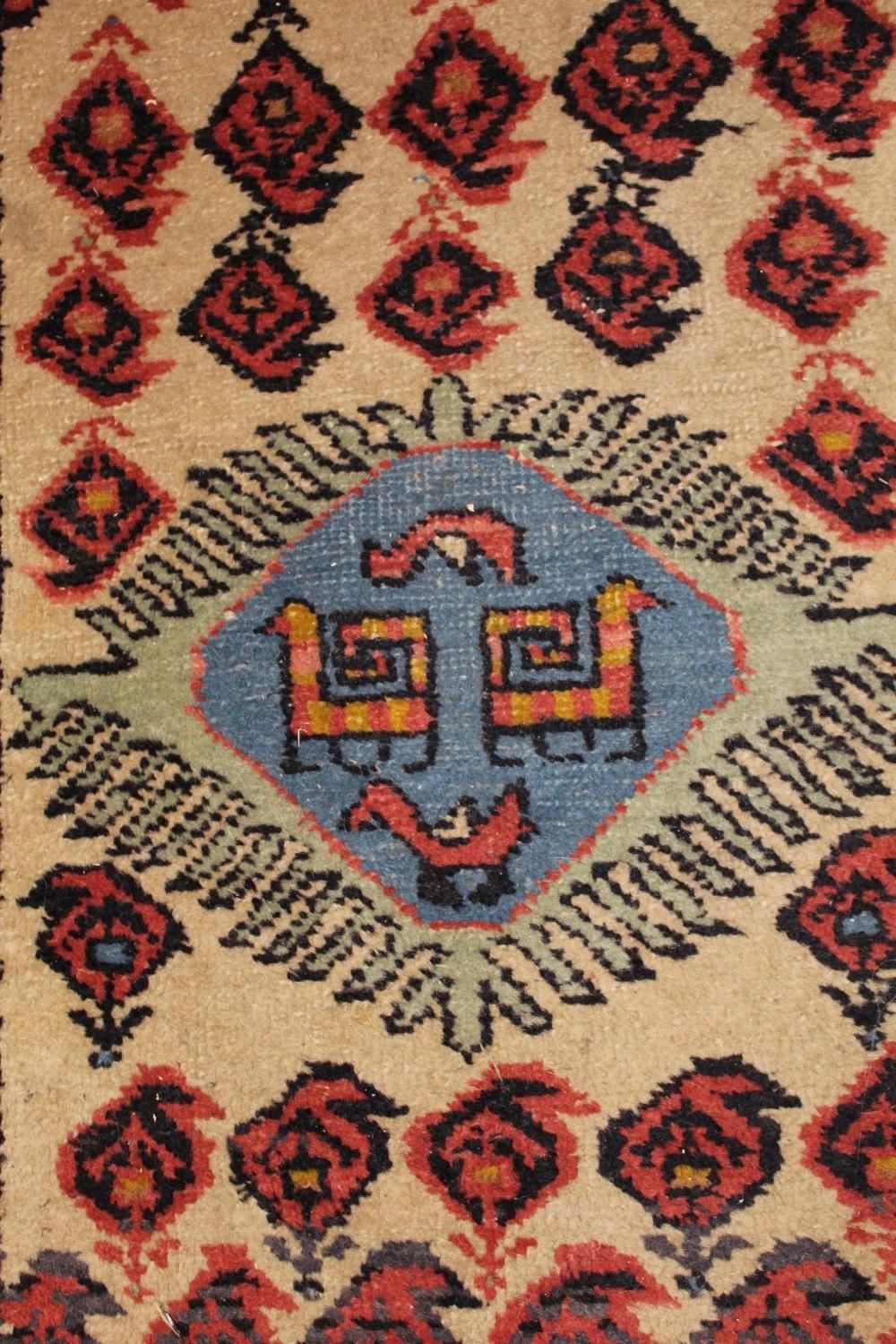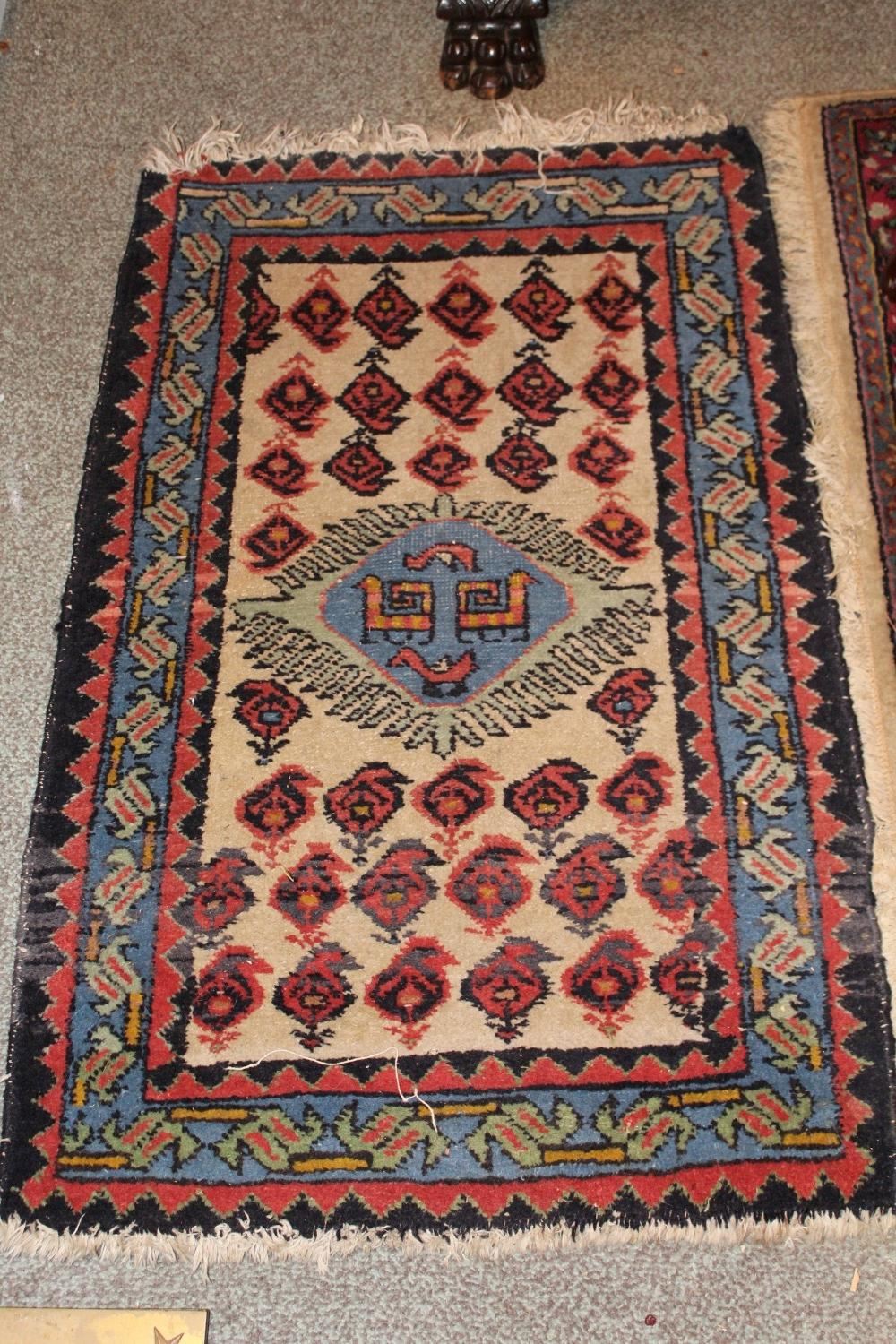 Beige Aztec pattern prayer rug. Birds in center. Approx. 42 inches long x 25 inches wide.
