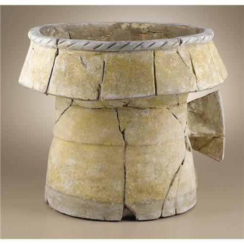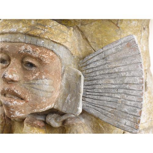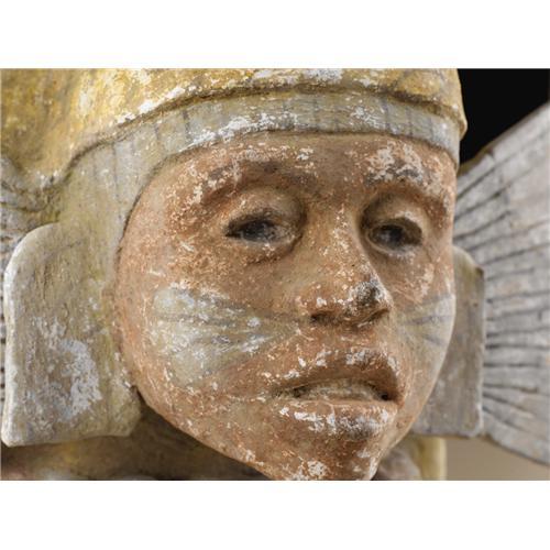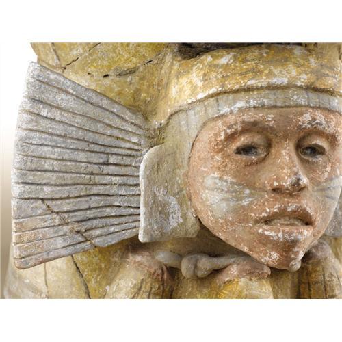 <B>Temple Brazier with a Face Mask of a Fertility Deity</B></I><BR>Aztec<BR>A.D. 1420 - 1520<BR>Ceramic, stucco, and paint<BR>Height 14 3/8 in.<BR><BR>The overall brazier shape seen here was standardized by Aztec times, probably deriving from both Toltec and Mixtec prototypes. The body of this brazier is yellow ocher, with a pale green rope-like element forming the top rim and a two-inch band of pale green around the bottom. The deity in whose rites a brazier served was set on the front, with appropriate attributes added. Here a fertility deity face is shown with a greenish knotted necklace from which hang maize heads (based on their yellow coloring). The reddish face has three-lobed greenish elements issuing onto the cheeks from the lower edge of the nose, while the hair at top is pale green. Above the latter a yellow, braided headband is shown. Ear covers of yellowish green complete the facial area. To either side of the head pale green pleated paper fans (<I>amacalli</B></I>) are shown. These were a part of the headdresses of deity impersonators in danced rituals. The color throughout is age-dimmed, and there is overall surface abrasion. While the head remained intact, the brazier has been shattered and is reassembled with relatively few areas of replacement.<BR><BR>Provenance<BR>William Siegal Gallery, Santa Fe, New Mexico<BR><BR>