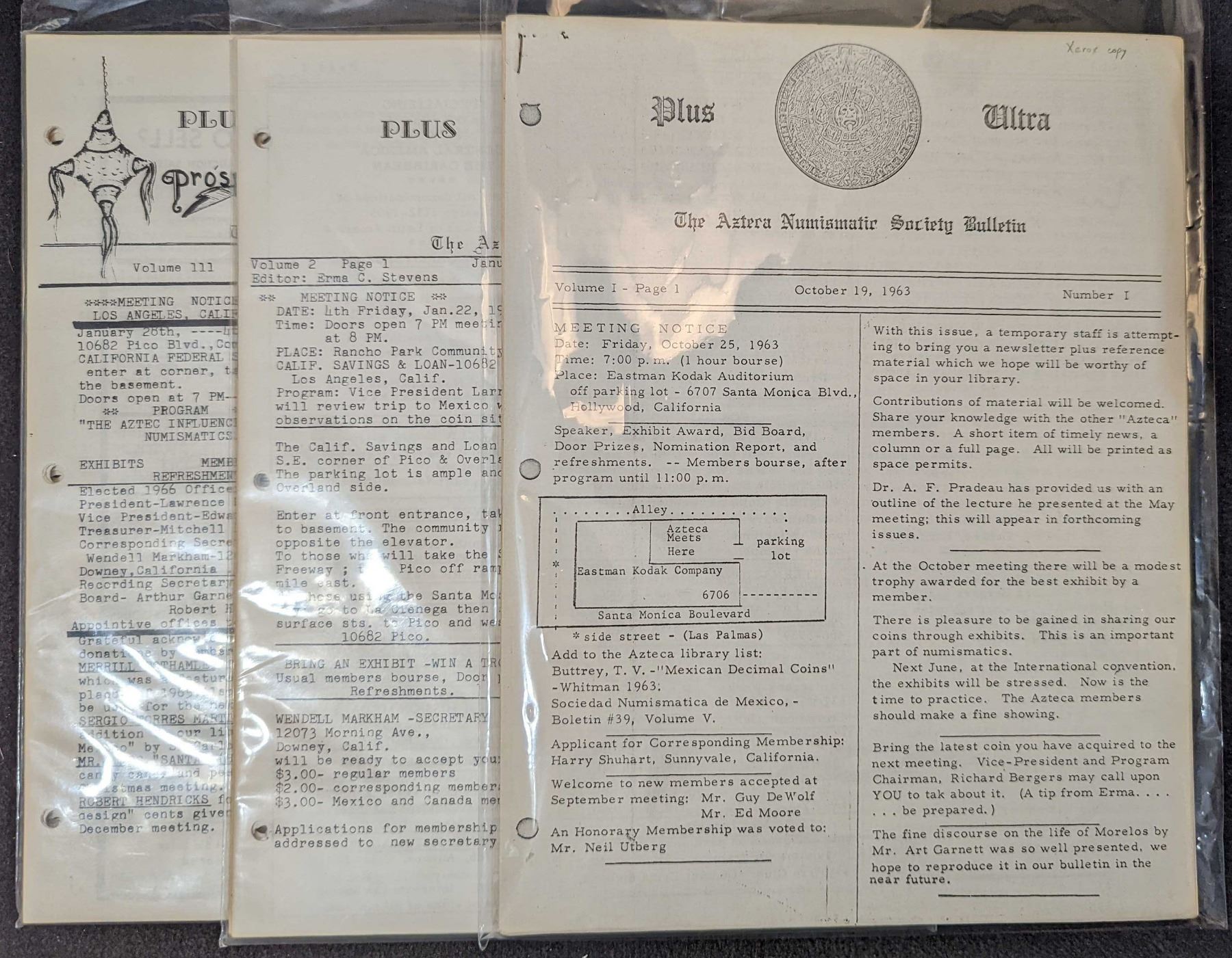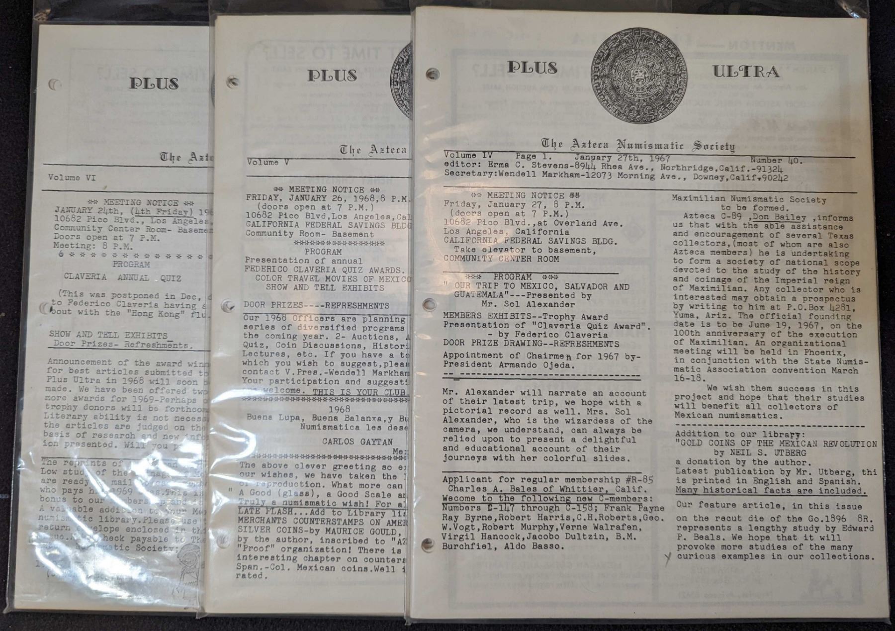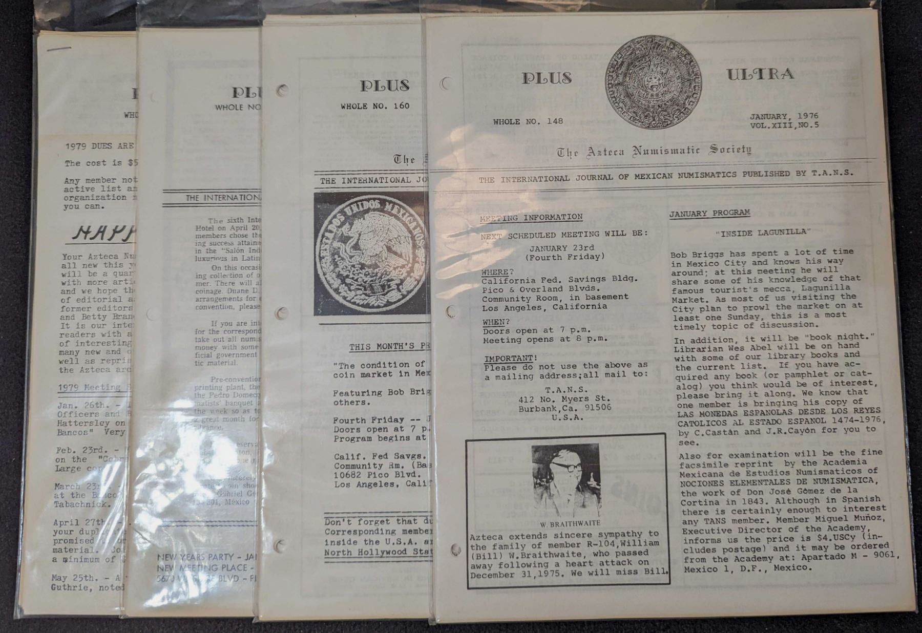 PLUS ULTRA. THE AZTECA NUMISMATIC SOCIETY BULLETIN. 187 ISSUES. 1963-1982. Azteca Numismatic Society. Granada Hills, California, et al, 1963-82. Nos. 1-187, 183 issues. missing numbers 168, 182-184. Near complete for the period covered. 8.5 by 11 inch format, stapled in upper corners, generally three-hole punched. Often folded for mailing, else near fine. The newsletter of the Azteca Numismatic Society, focusing on the numismatics of Mexico. Published herein are several short, but substantive articles. Distinguished authors such as: T.V. Buttrey, Clyde E. Hubbard, Don Carlos Gaytan, Duncan McConnell, Miguel L. Munoz, A.F. Pradeau, Holland Wallace and others in every issue. Diverse topics include Counterfeits, Medals, Rare Coins, 1913-16 Revolution issues, Tokens, Paper Money, Hacienda Tokens, Patterns, Gold, Suds, Mints, Modern Coinage and many more articles. Very rarely offered. Clain-Stefanelli #868. Lot weight: 6 lbs 7oz. Subject(s): Mexican Coinage, Paper Money, and Medals.