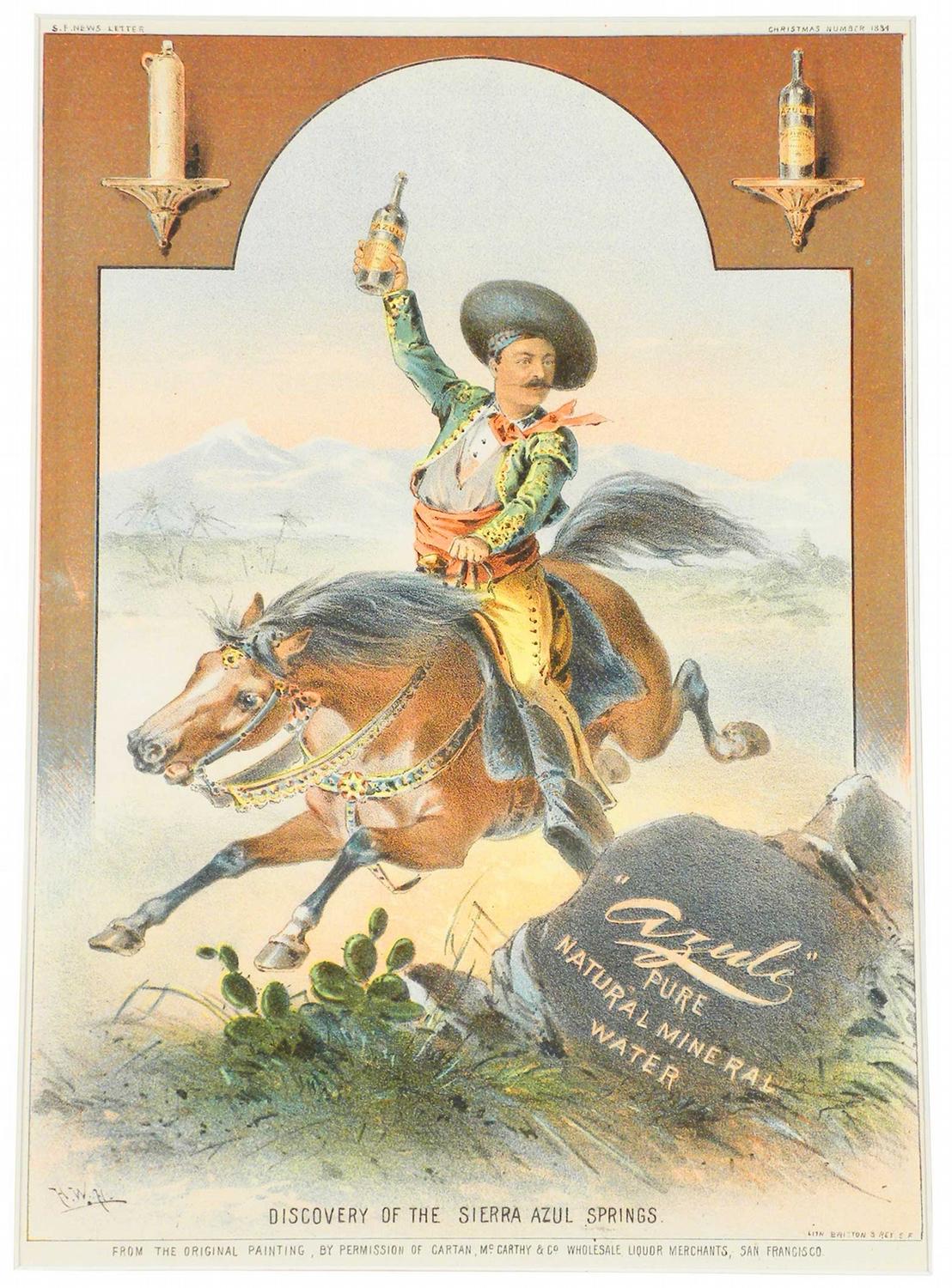 "Azule" Pure Natural Mineral Water Newspaper Re-print entitled, "Discovery of the Sierra Azul Springs. S.F. Newsletter, Christmas Number 1834. From the original painting, by permission of Cartan McCarthy & Co. Liquor Merchants, San Francisco. Excellent condition. 8 1/2 X 12 inches.