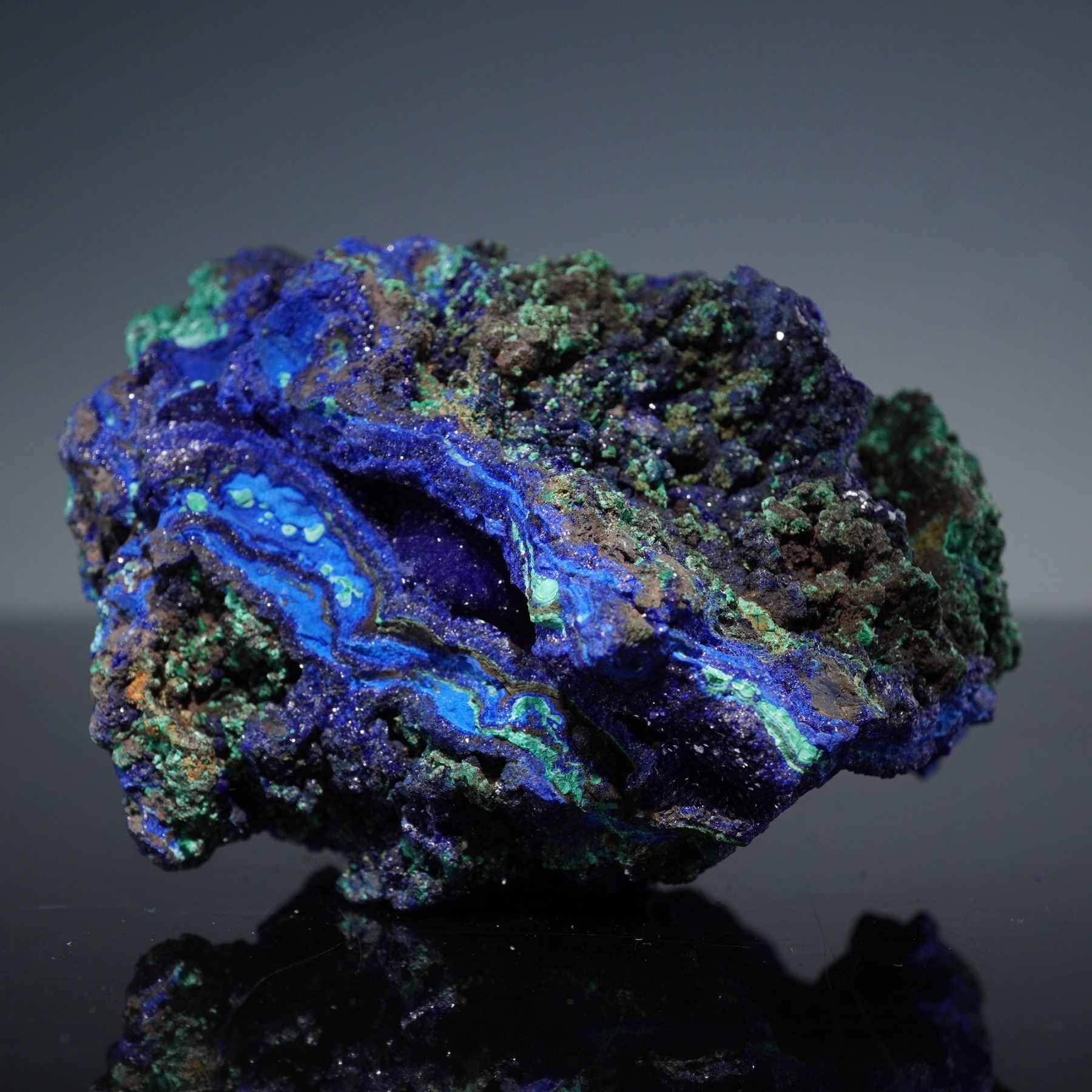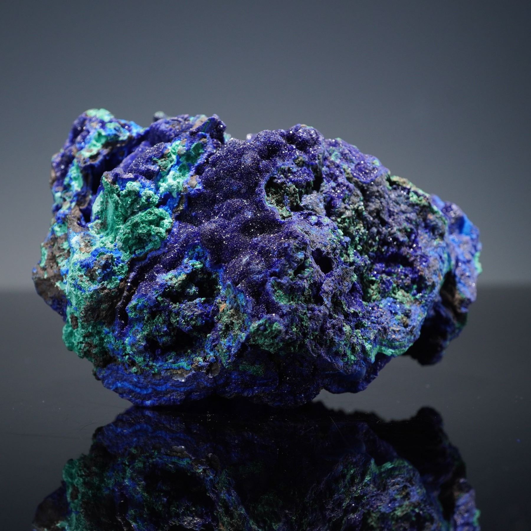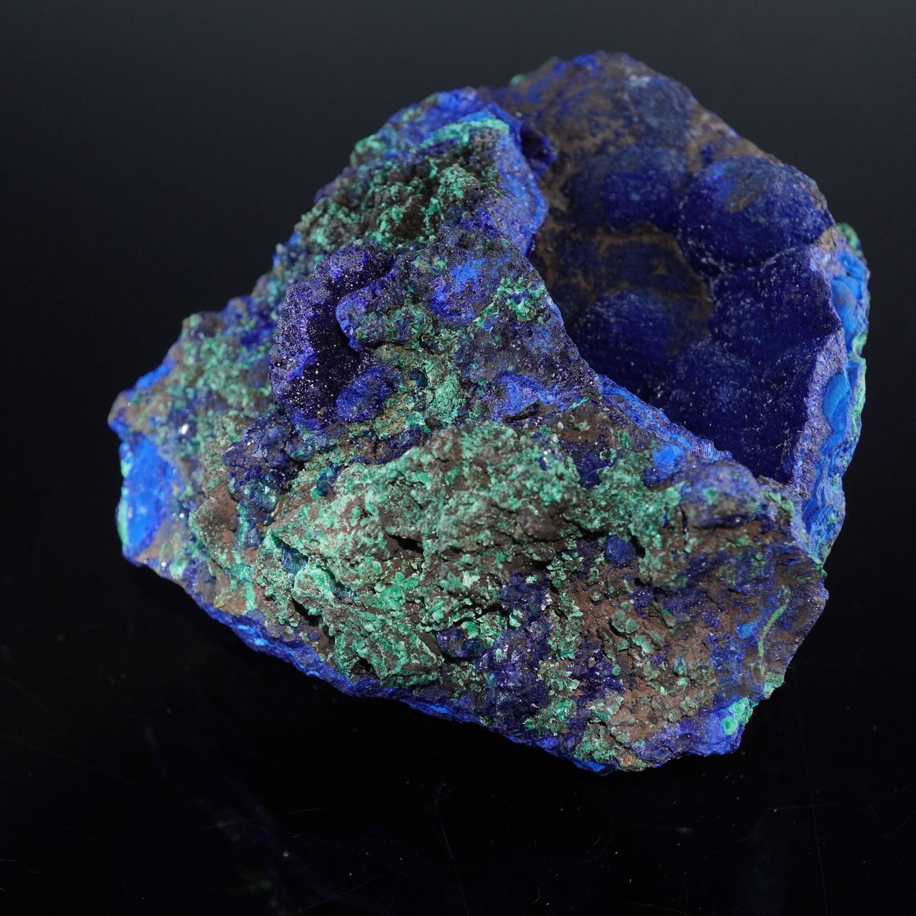 A captivating natural specimen showcasing the brilliant union of azurite's deep royal blue and malachite's vibrant green hues. This visually striking formation reveals layered bands and crystalline textures, offering mesmerizing contrast between velvety blue azurite and verdant malachite growths. The piece features intricate surface details with a lustrous sparkle that enhances its visual depth. Mined from copper-rich deposits, azurite and malachite form together as secondary minerals, symbolizing geological transformation and artistic beauty within nature. A stunning display piece ideal for collectors of fine minerals or as a centerpiece for natural history decor.