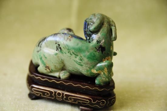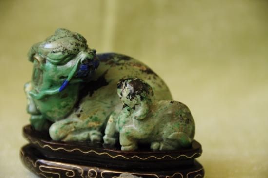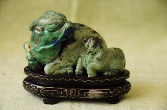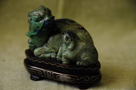 Azurite carving of a Beast with Cub on fitted wooden stand with silver inlay. 2,75? tall overall and 3,3? wide.